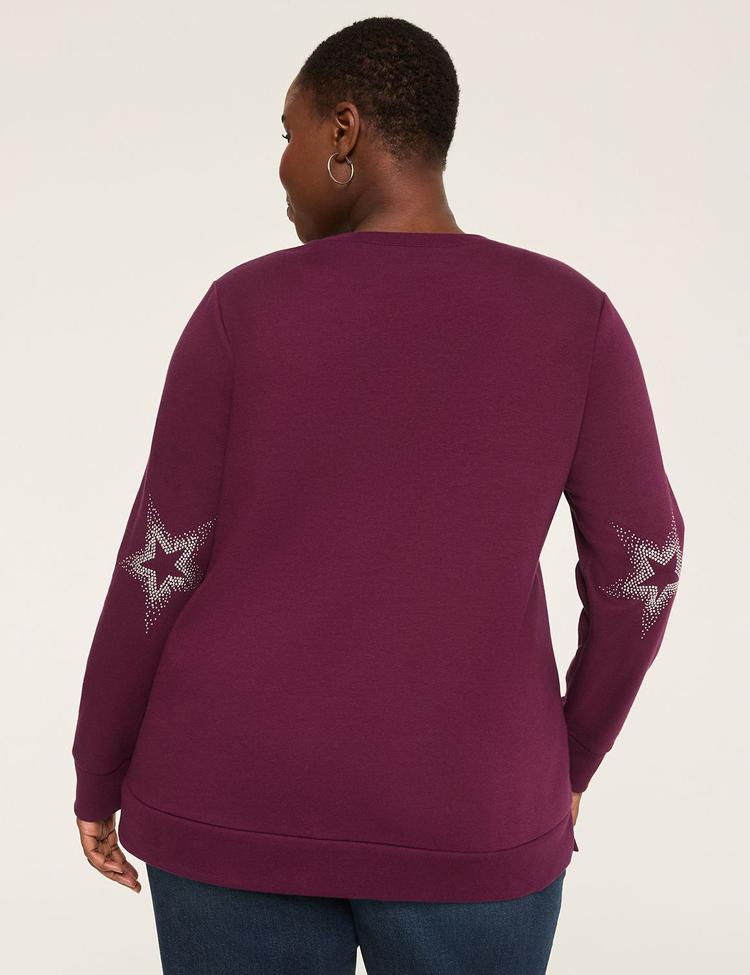 Available in Plus Size All that is bright...AKA this so-soft sweatshirt with shimmery star graphics. FIT: Classic. Designed for curves and a not-too-tight, not-too-loose, just-right fit. Front Body Length From Shoulder: 31" (On Size 18) Longer length is perfect for added coverage. FEATURES: Crew neck Long sleeves Banded cuffs and hem Ribbed trim Side slits at hem for ease & movement SPECIAL DETAIL: Rhinestone graphic FABRIC: Ultra-cozy french terry fabric with a not-too-light, not-too-heavy feel. Turn Inside OutMachine Wash Cold With Like ColorsOnly Non-Chlorine Bleach When NeededTumble Dry LowCool Iron If NeededDo Not Iron Decoration Self: 60% Cotton 40% PolyesterContrast: 57% Cotton 38% Polyester 5% Spandex Item Number #413375 Imported Plus Size Top ". Plus Size Rhinestone Star Graphic Sweatshirt, in Plum, 10/12, Women's, Lane Bryant
