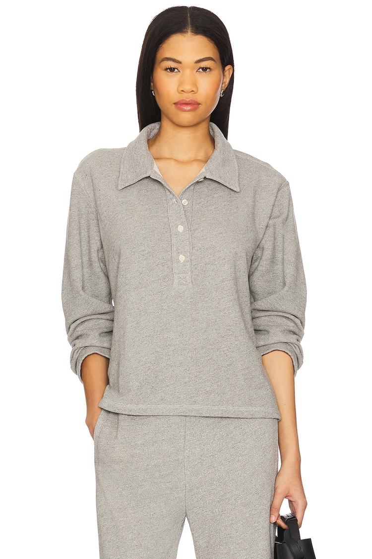 This relaxed-fit blouson sweatshirt features a classic turn-down collar and partial front button closure for easy wear. Crafted from a midweight French terry fabric blend of cotton and polyester, it offers comfortable casual chic style perfect for spring and autumn. The hip-length cut and long regular sleeves provide a laid-back silhouette ideal for loungewear, travel, and everyday casual occasions. Its solid gray hue and minimal design embody minimalist aesthetics with versatile appeal.