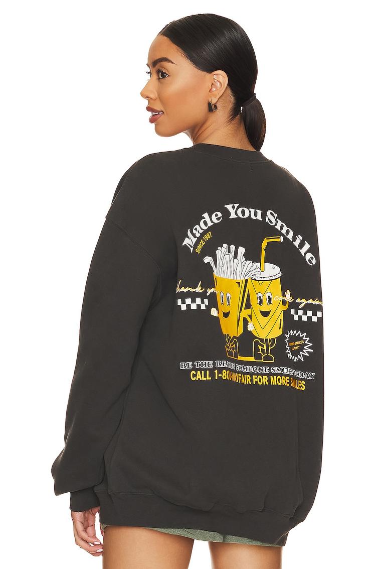 This black sweatshirt from The Mayfair Group features a loose fit and hip-length silhouette crafted from a heavyweight cotton-polyester blend jersey fabric. It has a classic crew neckline and long regular sleeves with ribbed cuffs. Graphic prints in yellow and white adorn the front left breast and the back, adding a street style vibe. Pullover closure ensures easy wear, making it perfect for casual outings, loungewear, and streetwear looks in autumn through spring seasons.
