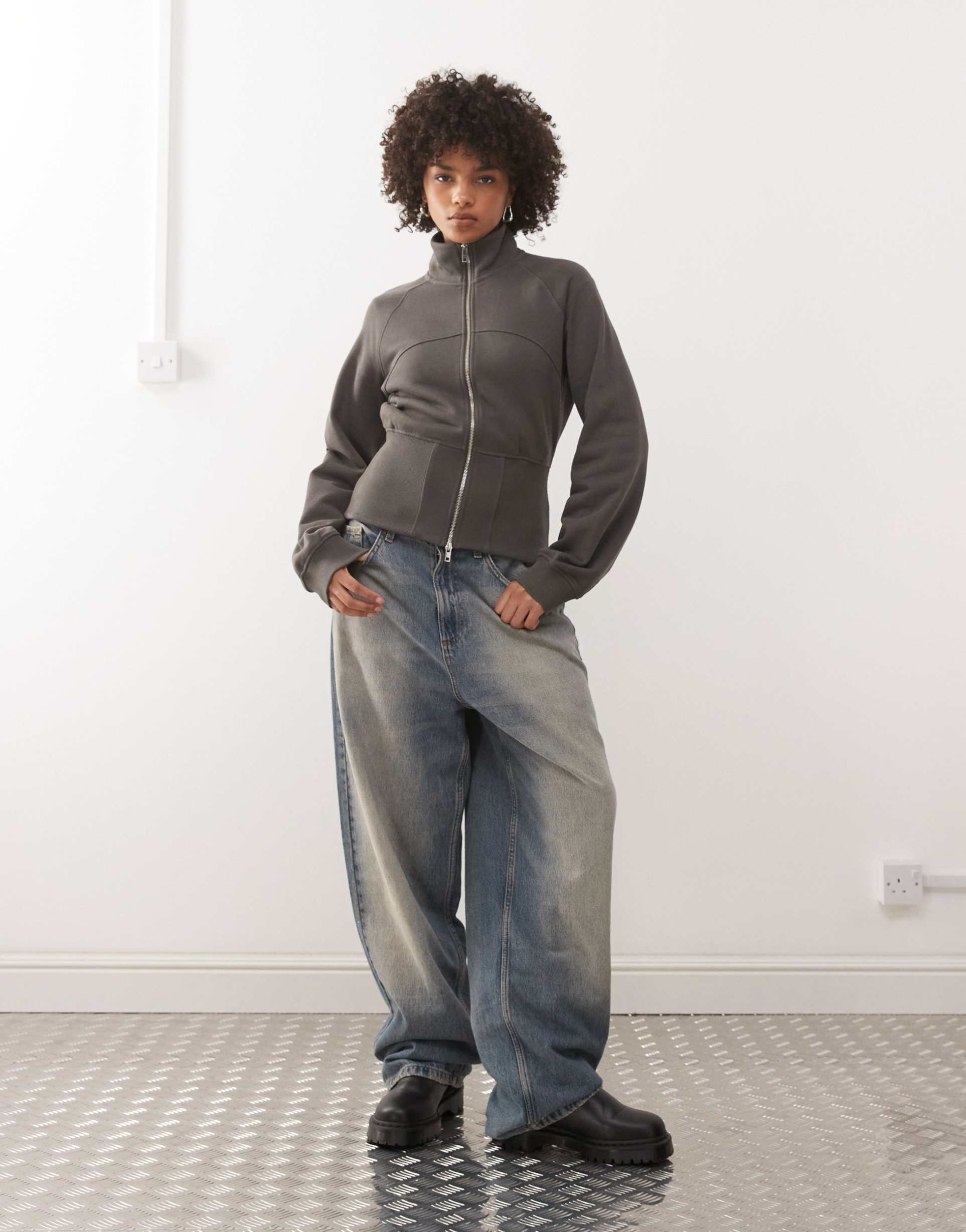 WEEKDAY HIGH NECK ZIP UP SWEATSHIRT WITH CINCHED WAIST IN DARK GRAY