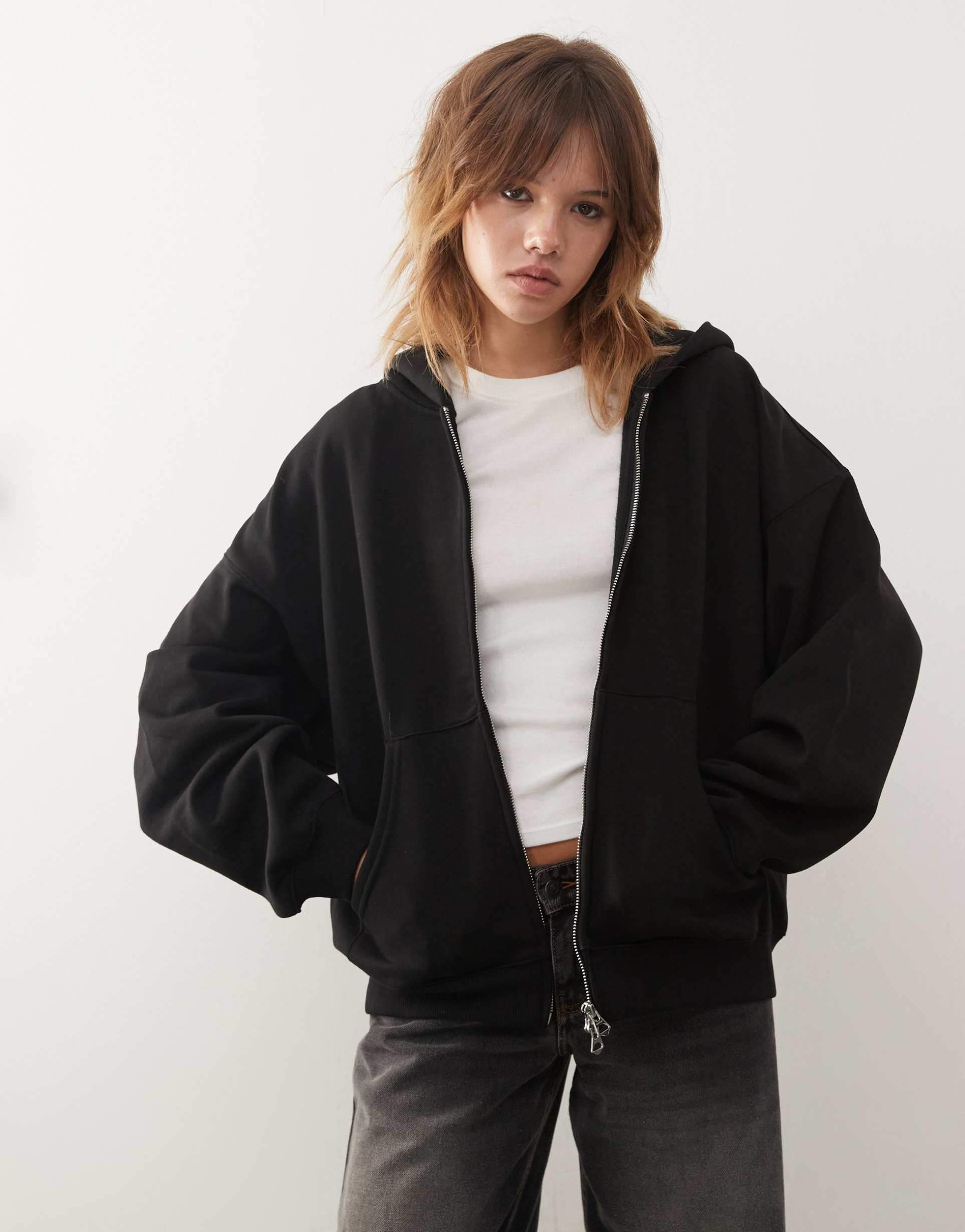 WEEKDAY OVERSIZED HEAVYWEIGHT JERSEY ZIP THROUGH HOODIE IN BLACK
