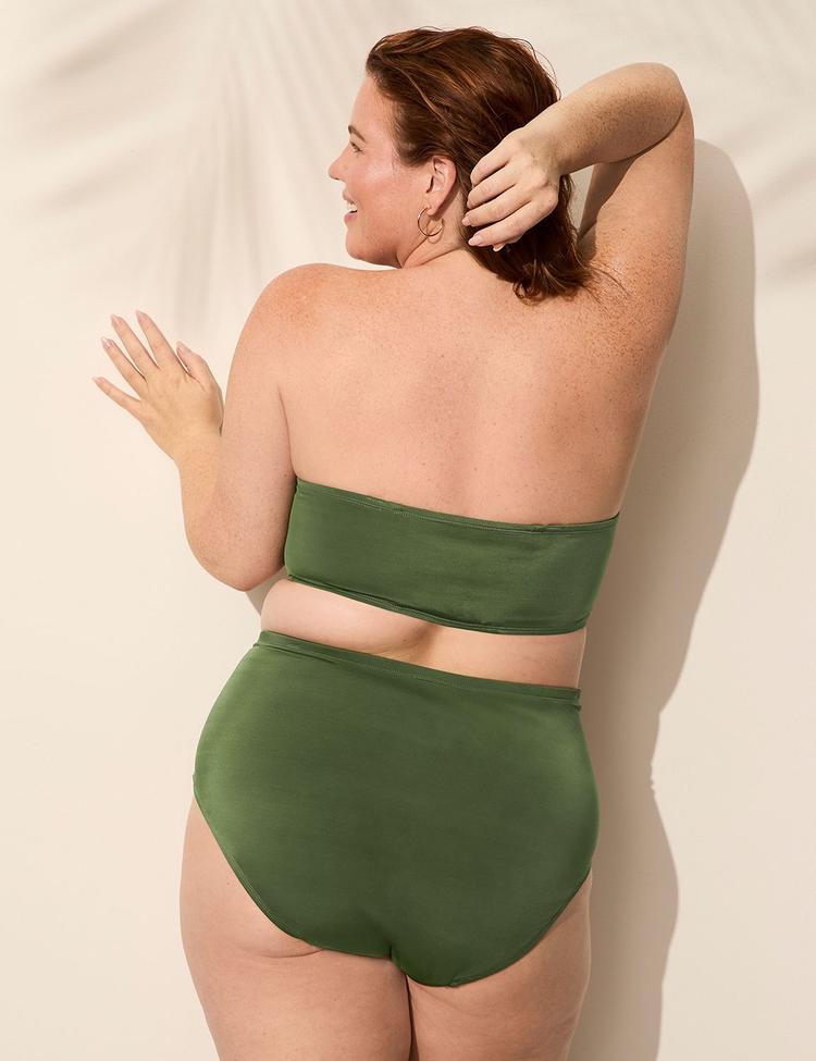 Embrace timeless beachwear with this plus size bandeau cropped bikini top in a matte olive hue. Designed with underwire and a hook-and-eye closure, it offers superior support and a fitted silhouette. The strapless design and straight neckline create a sleek, classic look perfect for summer pool days, beach vacations, and casual seaside outings. Crafted from eco-conscious polyester and elastane blend, this bikini top combines comfort with thoughtful construction, making it a versatile and flattering addition to your swimwear collection.
