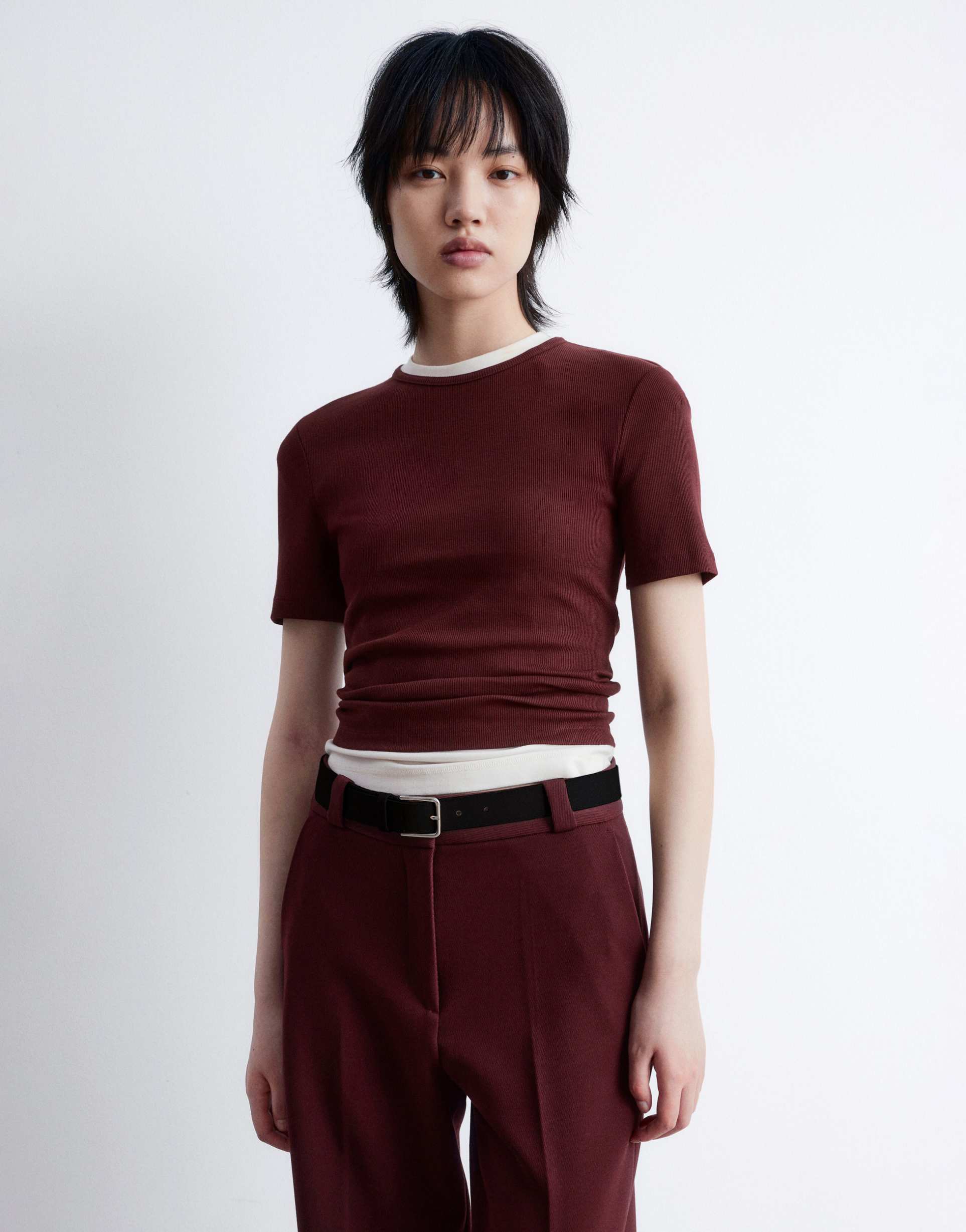 & OTHER STORIES SUPER SOFT JERSEY RIBBED T-SHIRT IN BURGUNDY WINE