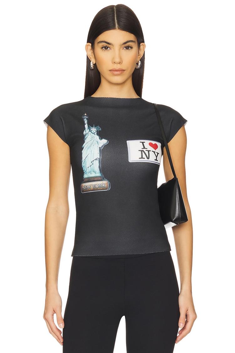 A sleek fitted tunic in matte black features a classic crew neckline and cap sleeves for a modern silhouette. Crafted from lightweight polyester-spandex jersey, this hip-length top offers breathable comfort with a subtle stretch. The standout front graphic print showcases iconic NYC imagery in muted light blue, white, red, and brown tones, enhancing its street style vibe. Ideal for casual outings, everyday wear, or travel, its pullover design makes it an easy addition to any wardrobe seeking a trendy, chic edge.