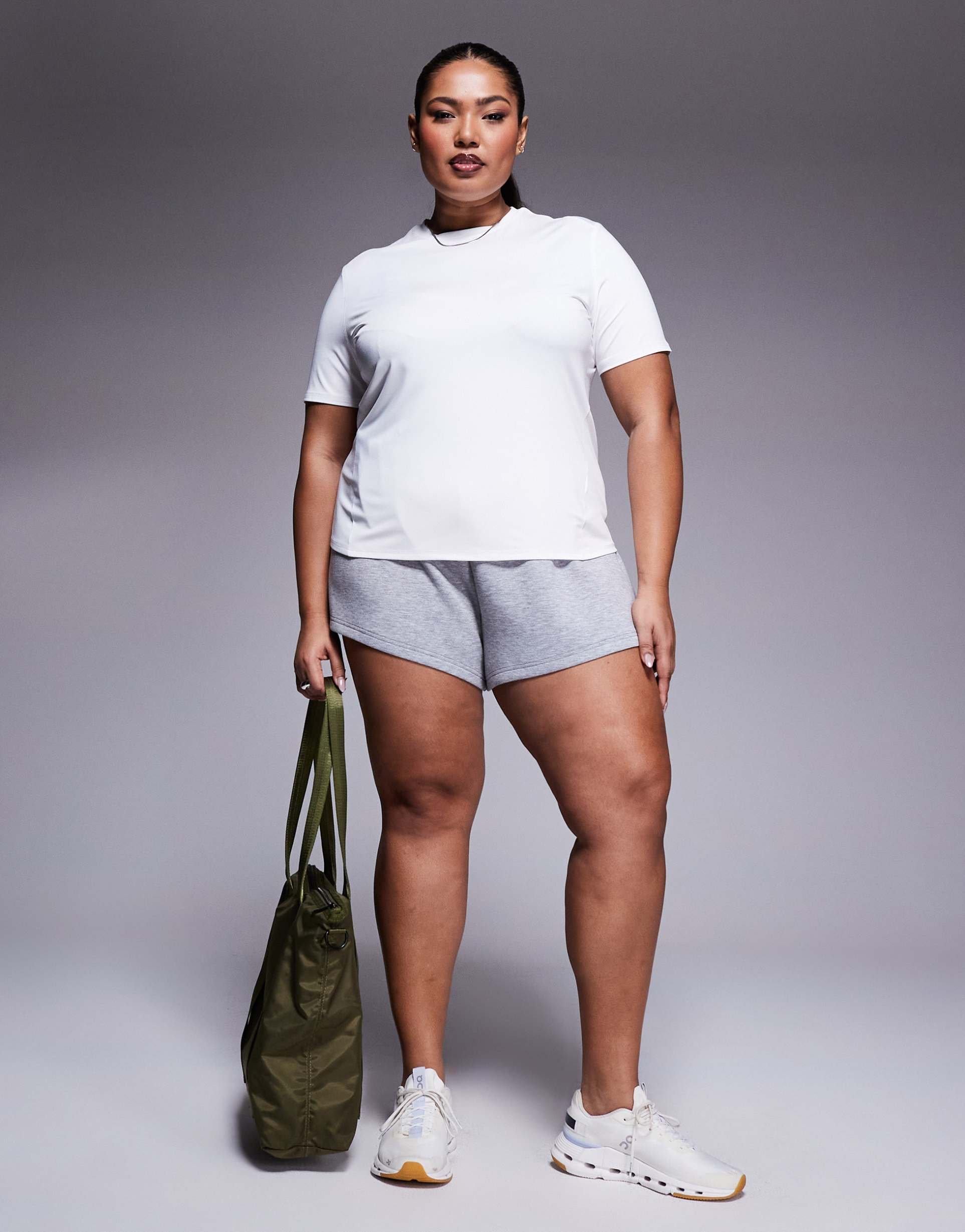 Soft and stretchy polyester-elastane jersey fabric defines this plus size tunic length T-shirt with a classic crew neck and half sleeves. Its regular fit and hip length hemline ensure comfortable movement during workouts or casual days. The solid white color and pullover closure add to its versatile sporty chic appeal, making it ideal for athleisure, workout, and casual occasions. A practical essential designed for all-weather wear, this quick-dry performance top combines comfort and function effortlessly.