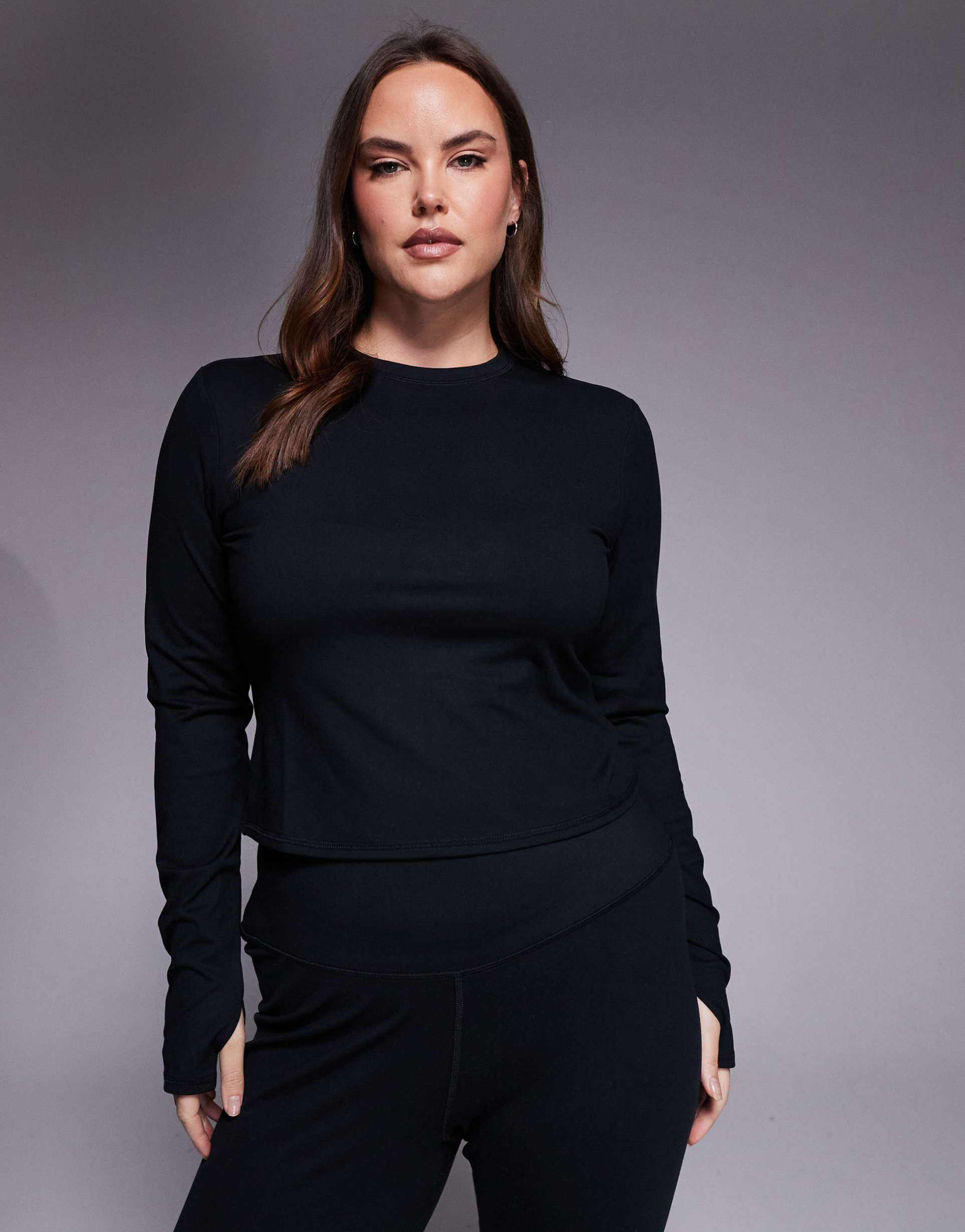 Smooth, stretchy polyester-elastane fabric defines this long-sleeve crew neck top, crafted with a regular fit that flatters plus size figures. The hip-length silhouette features thumbhole cuffs to keep sleeves in place and flatlock seams to reduce friction during movement. A solid black hue and minimalist sporty chic style make it an ideal choice for workouts, athleisure days, and casual outings alike, blending comfort and performance effortlessly.