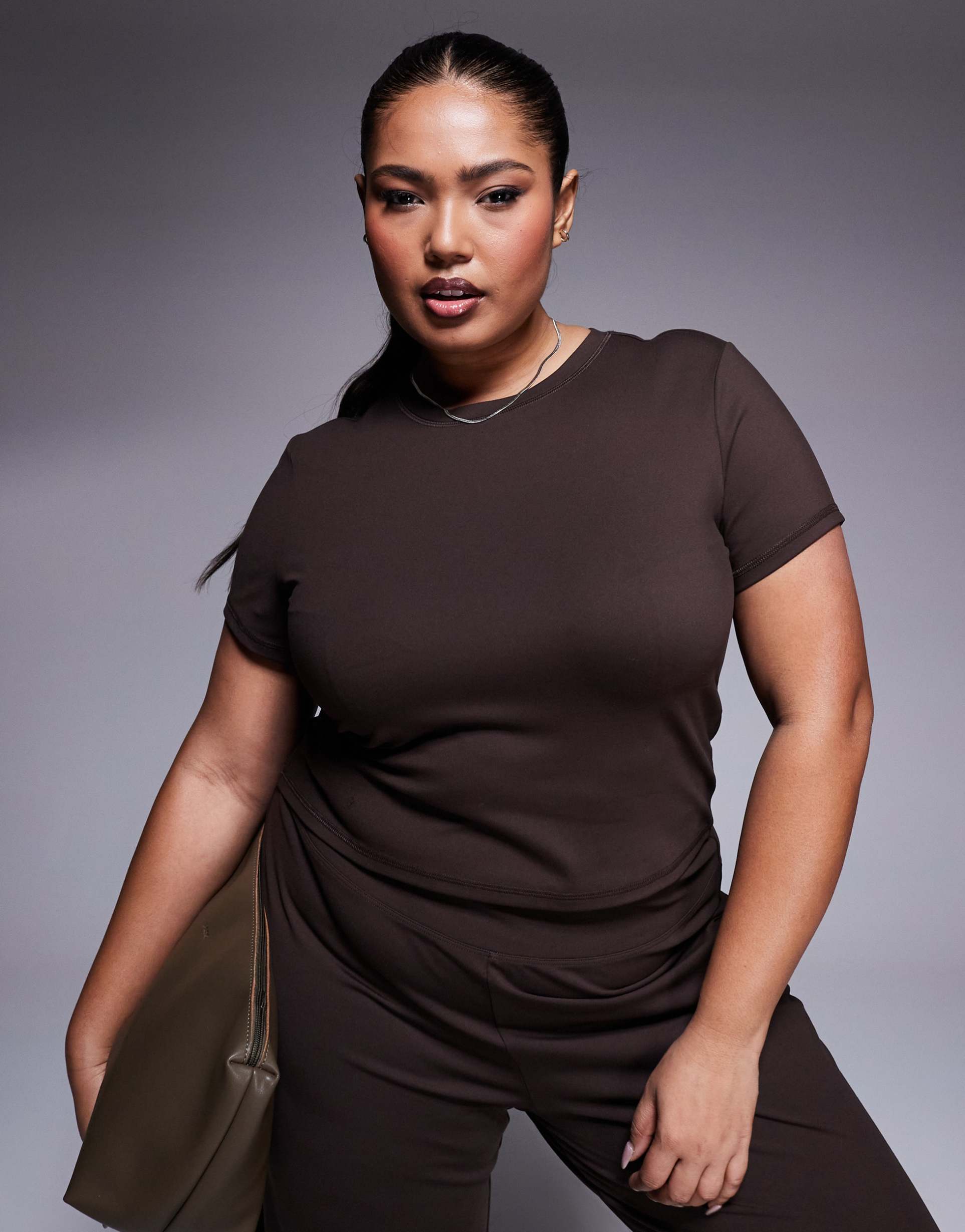 Soft-touch polyester-elastane blend fabric shapes this plus-size curve icon shell in a rich matte brown hue. Featuring a classic crew neck and half sleeves, the slim fit silhouette enhances the natural shape with sleek hip-length coverage. Minimalist in design, this versatile tee suits casual days, loungewear comfort, and everyday wear. Its stretchy jersey fabric ensures ease of movement while maintaining a refined, clean look perfect for relaxed outings or layering under jackets for workwear or casual chic occasions.