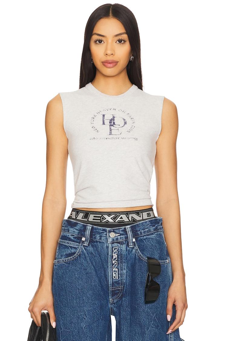 Soft, midweight cotton jersey forms a fitted baby muscle tank with a classic crew neckline and sleeveless strapless styling. The waist-length silhouette features a clean, raw cut hem for an edgy finish, while a bold front graphic adds minimalist streetwear appeal. Ideal for warm spring and summer days, this versatile piece pairs perfectly with casual jeans or layered looks, making it a go-to for everyday wear, street style, and laid-back casual outings.