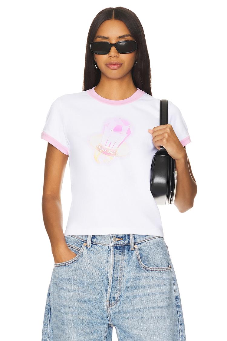 Soft cotton jersey fabric and a regular fit define this Alexander Wang cropped ringer tee. Featuring a classic crew neck and half sleeves with pink cuffed edges, its waist-length silhouette complements casual denim perfectly. The front showcases a subtle pink graphic that adds a touch of youthful charm without overpowering the minimalist design. Ideal for spring and summer days, this versatile tee suits casual outings, brunch dates, and everyday wear with ease.