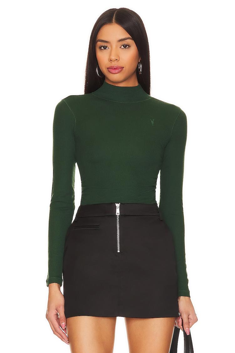 Soft ribbed jersey fabric and a sleek mock neck create a fitted long sleeve tee in a rich dark green hue. This waist length, minimalist tank top offers a modern silhouette perfect for layering or wearing alone. Its comfortable blend of lyocell and elastane makes it ideal for transitional seasons like autumn, winter, and spring. Versatile enough for casual days, workwear, or business casual settings, it pairs effortlessly with skirts or pants for a chic, polished look.