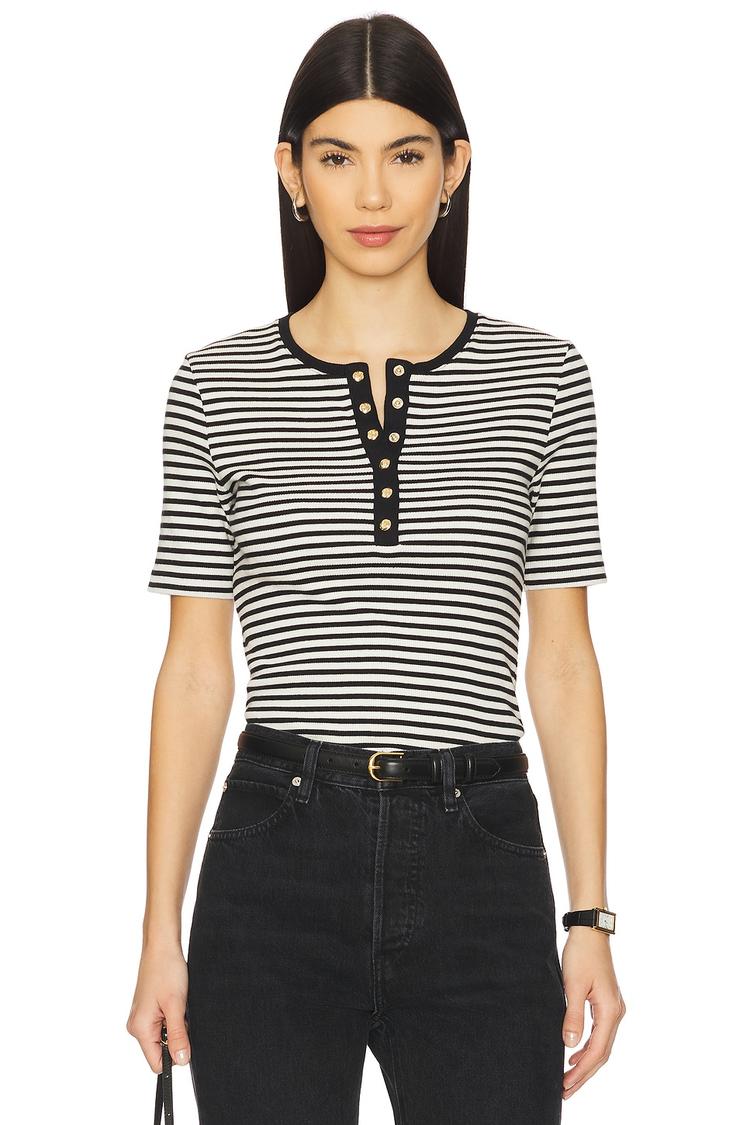 Midweight ribbed cotton-elastane fabric forms this classic slim-fit Henley tee, featuring a round neckline and half-length regular sleeves for comfortable coverage. The hip-length silhouette with all-over black and white stripes creates a timeless, minimalist vibe ideal for casual outings, everyday wear, or business casual settings. Partial front snap button closures add subtle functional detail, enhancing the shirt's versatile appeal. This Alessia Tee blends modern casual chic with enduring style, perfect for spring through autumn seasons when layering or standalone wear is desired.