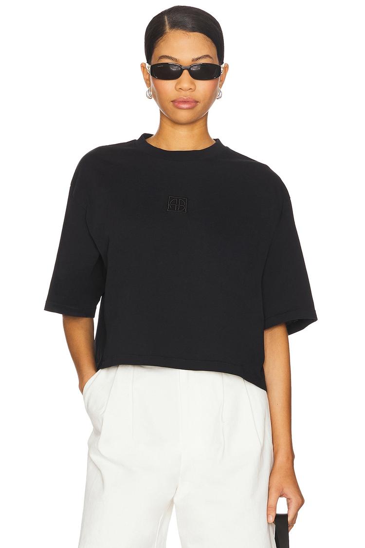 Relaxed and effortlessly cool, this cropped tee features a classic crew neck and elbow-length regular sleeves crafted from midweight cotton jersey. The minimalist black silhouette is elevated by a subtle logo embroidery on the front, adding a refined touch to its casual chic vibe. Its loose fit and pullover style make it an easy layering piece perfect for spring, summer, and autumn days. Ideal for everyday wear, brunch dates, or casual outings, this versatile top blends comfort with understated style.