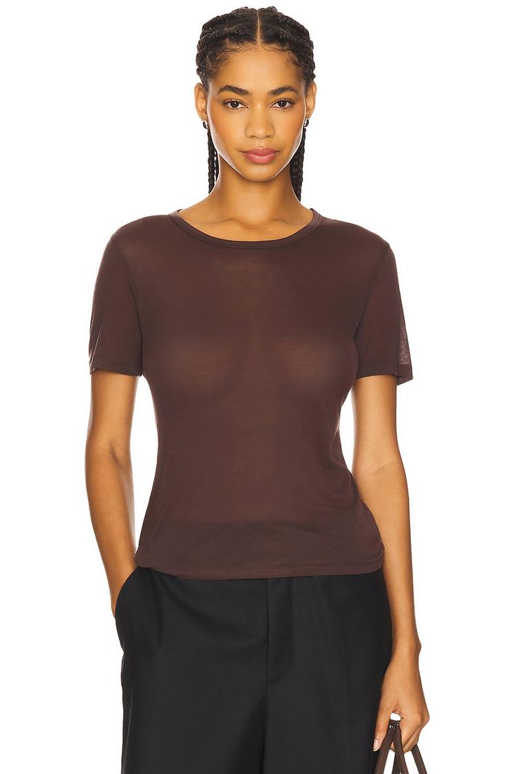 Softly fitted with a classic round neckline, this brown shell tee crafted from a semi-sheer lyocell and wool blend offers lightweight warmth and elegance. Its hip-length silhouette and half sleeves make it an ideal choice for layering or standalone wear. Perfectly suited for casual days, workwear, and business casual settings, this minimalist and chic tee blends comfort and style seamlessly across autumn, winter, and spring seasons.