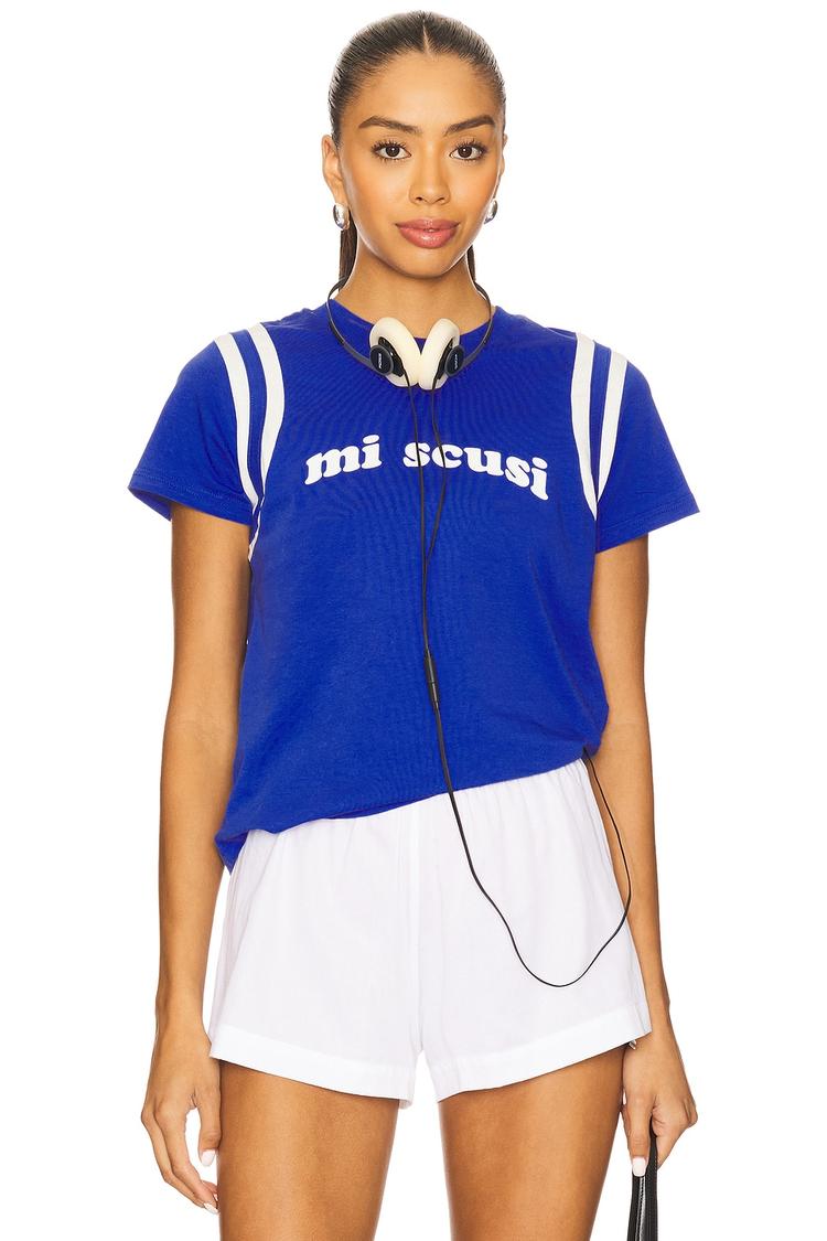 Classic comfort meets sporty style in this Araminta James Mi Scusi Babydoll tee crafted from lightweight cotton jersey. The vibrant matte blue base is accented with bold white stripes on the shoulders and a contrasting white script logo on the front, creating a fresh, casual chic look. Featuring a crew neck and half sleeves, this hip-length tee offers a regular fit ideal for everyday wear. Perfect for spring and summer days, it transitions effortlessly from streetwear to casual outings and everyday errands with ease.