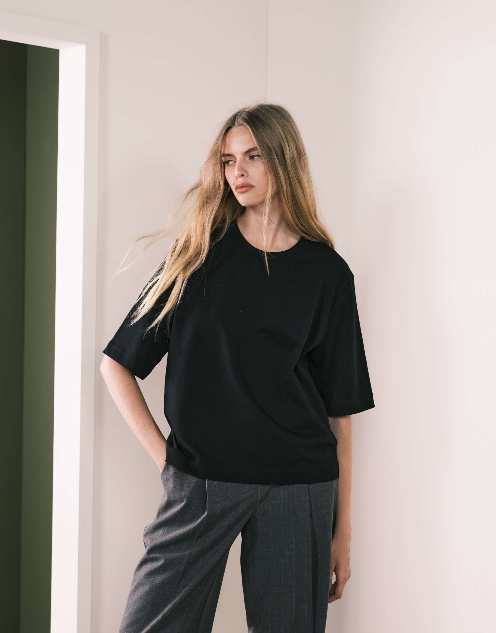 Soft, heavyweight cotton and a boxy fit define this ARKET t-shirt, crafted for effortless style and comfort. Featuring a classic crew neck and half sleeves, its hip-length silhouette makes it a versatile piece for casual outings, everyday wear, or workwear settings. The solid matte black hue enhances its minimalist appeal, while the stretchy jersey fabric ensures ease of movement. This t-shirt blends simplicity with function, perfect for layering or wearing solo in any season.