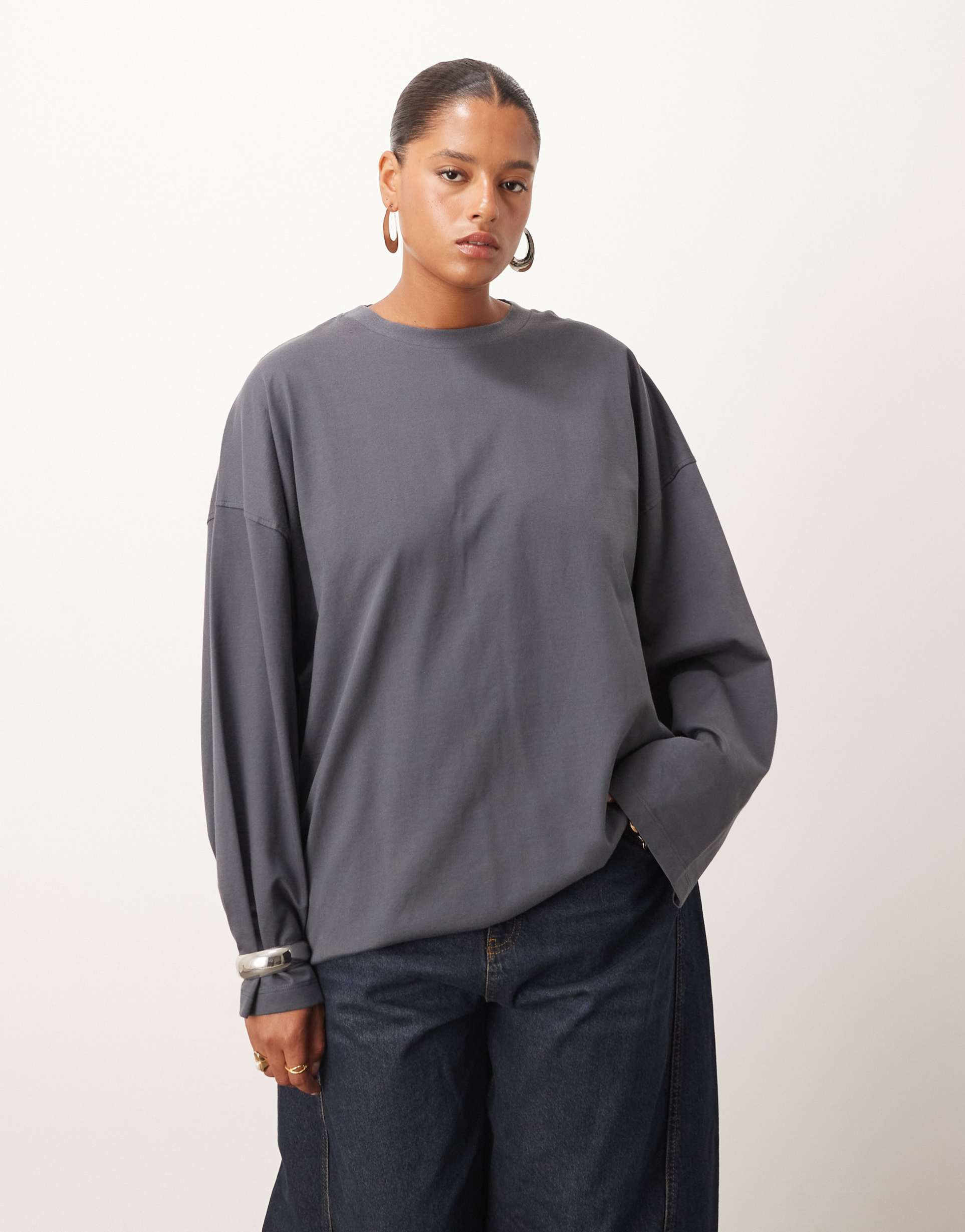 ARRANGE CURVE COTTON OVERSIZED LONG SLEEVE T-SHIRT IN CHARCOAL