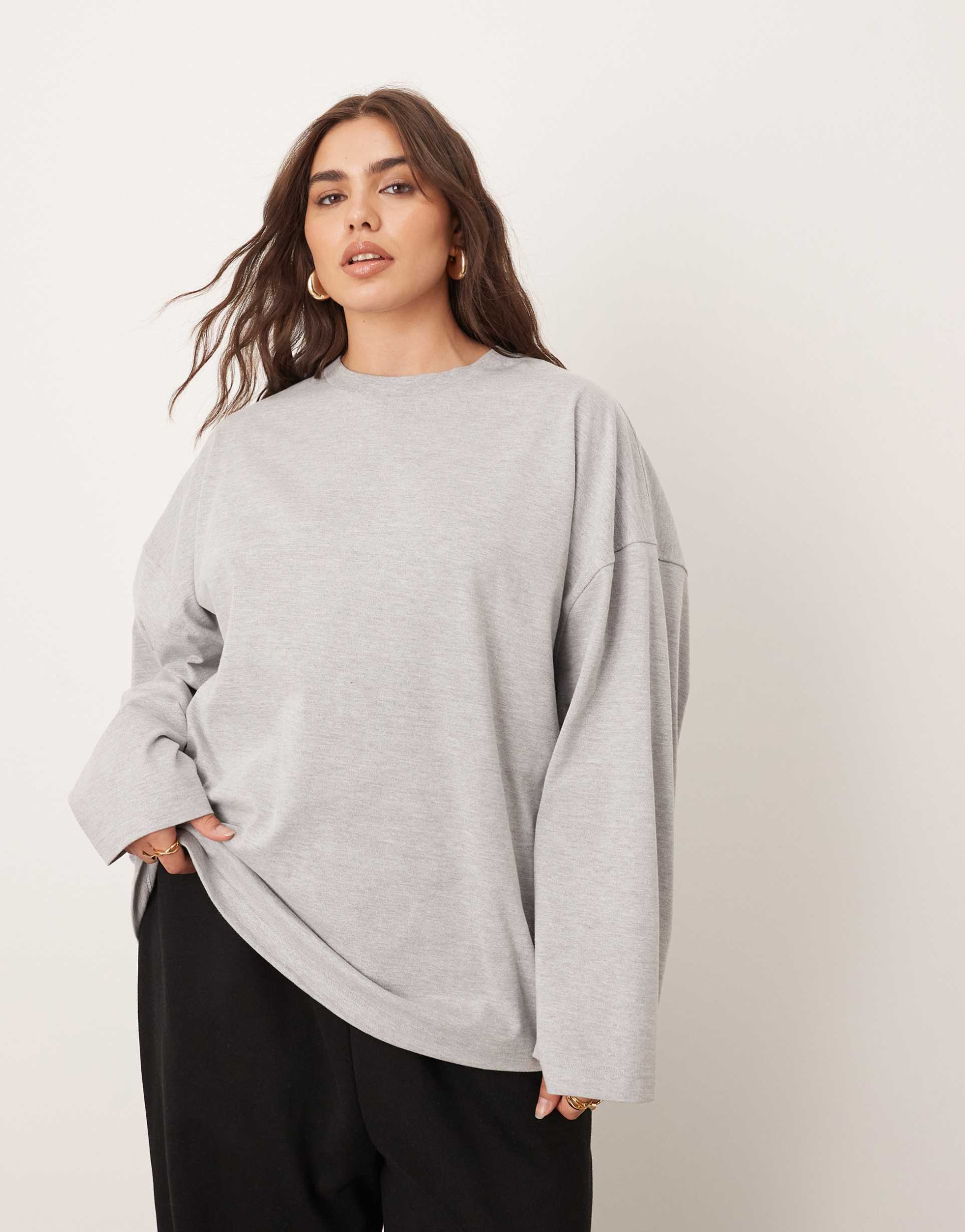 ARRANGE CURVE COTTON OVERSIZED LONG SLEEVE T-SHIRT IN HEATHER GRAY