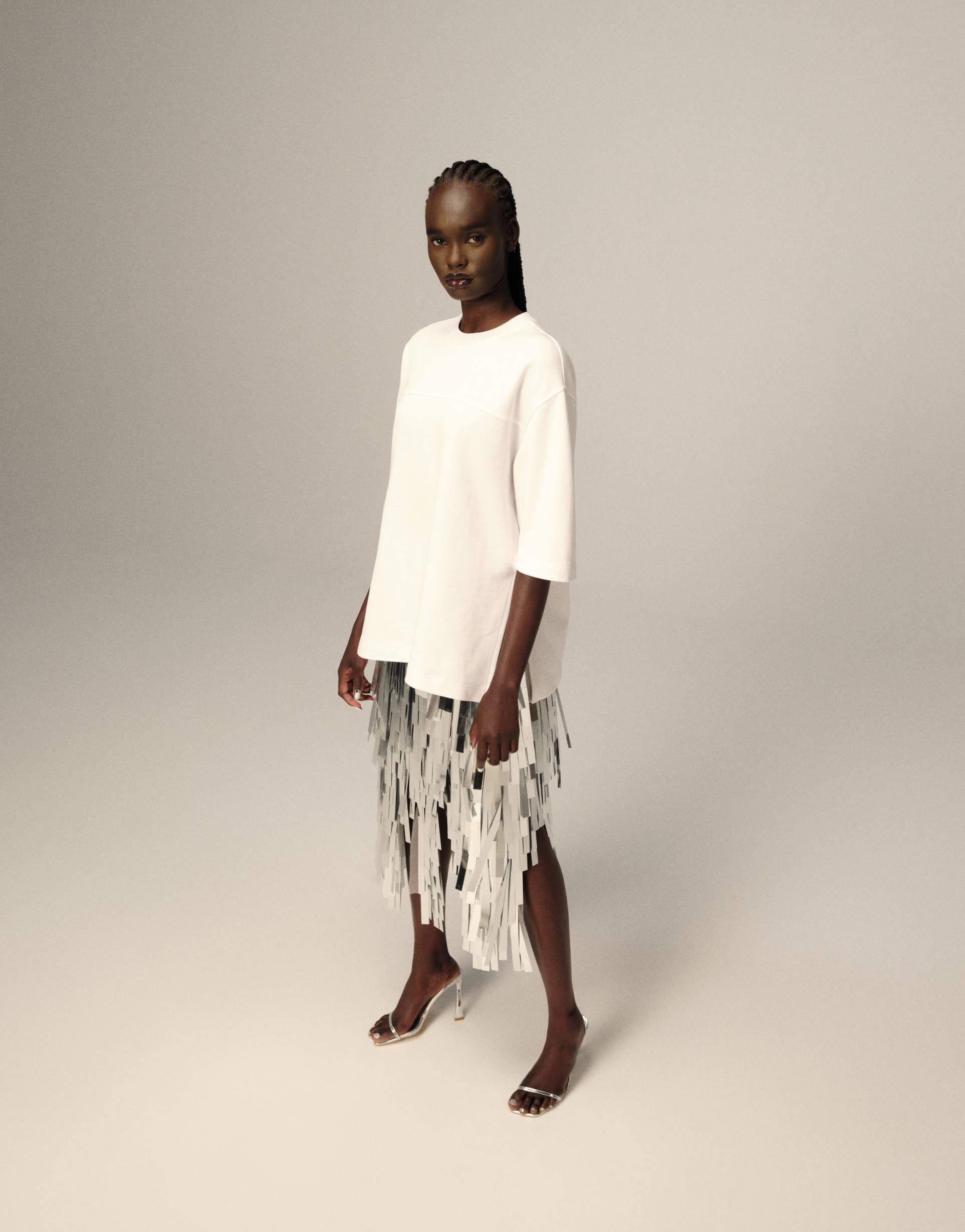 Soft, heavyweight cotton jersey crafts this oversized tunic with a minimalist vibe. The hip-length silhouette features a classic crew neck, drop shoulders, and three-fourth sleeves, offering a relaxed fit with side slits for effortless movement. Seam detailing adds subtle texture throughout, making it an ideal piece for casual outings, everyday wear, or comfortable loungewear. Its clean white hue and simple design deliver versatility that pairs well with jeans or leggings for a polished yet laid-back look.