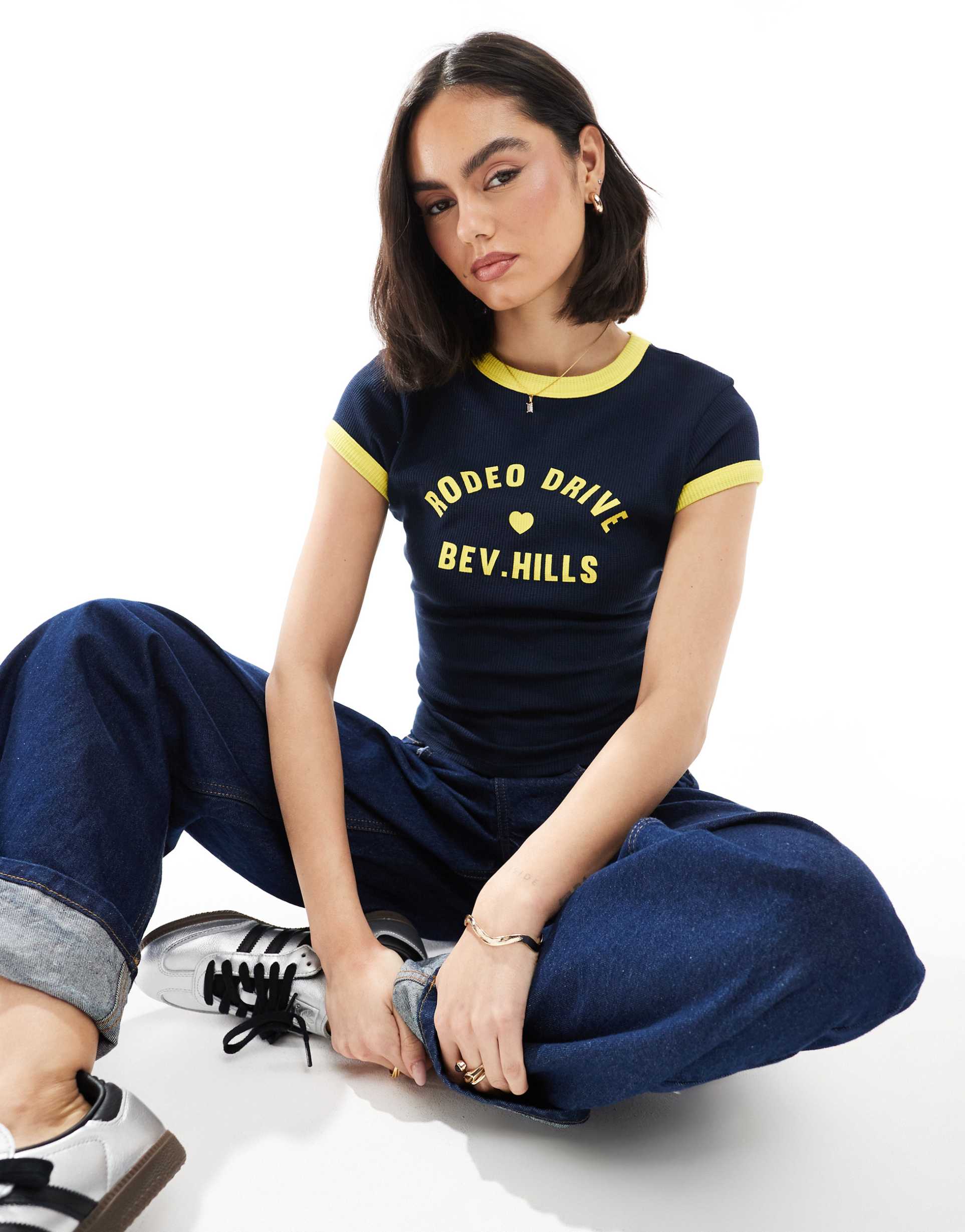Soft cotton jersey with a distinctive waffle texture defines this cropped baby tee, featuring a classic crew neckline and cap sleeves for a sleek silhouette. The slim fit contours the body perfectly, while the bright yellow Beverly Hills graphic and sleeve trims add a playful pop against the deep navy base. Ideal for casual outings, streetwear looks, and weekend brunches, this versatile piece blends comfort with a sporty, minimalist style.