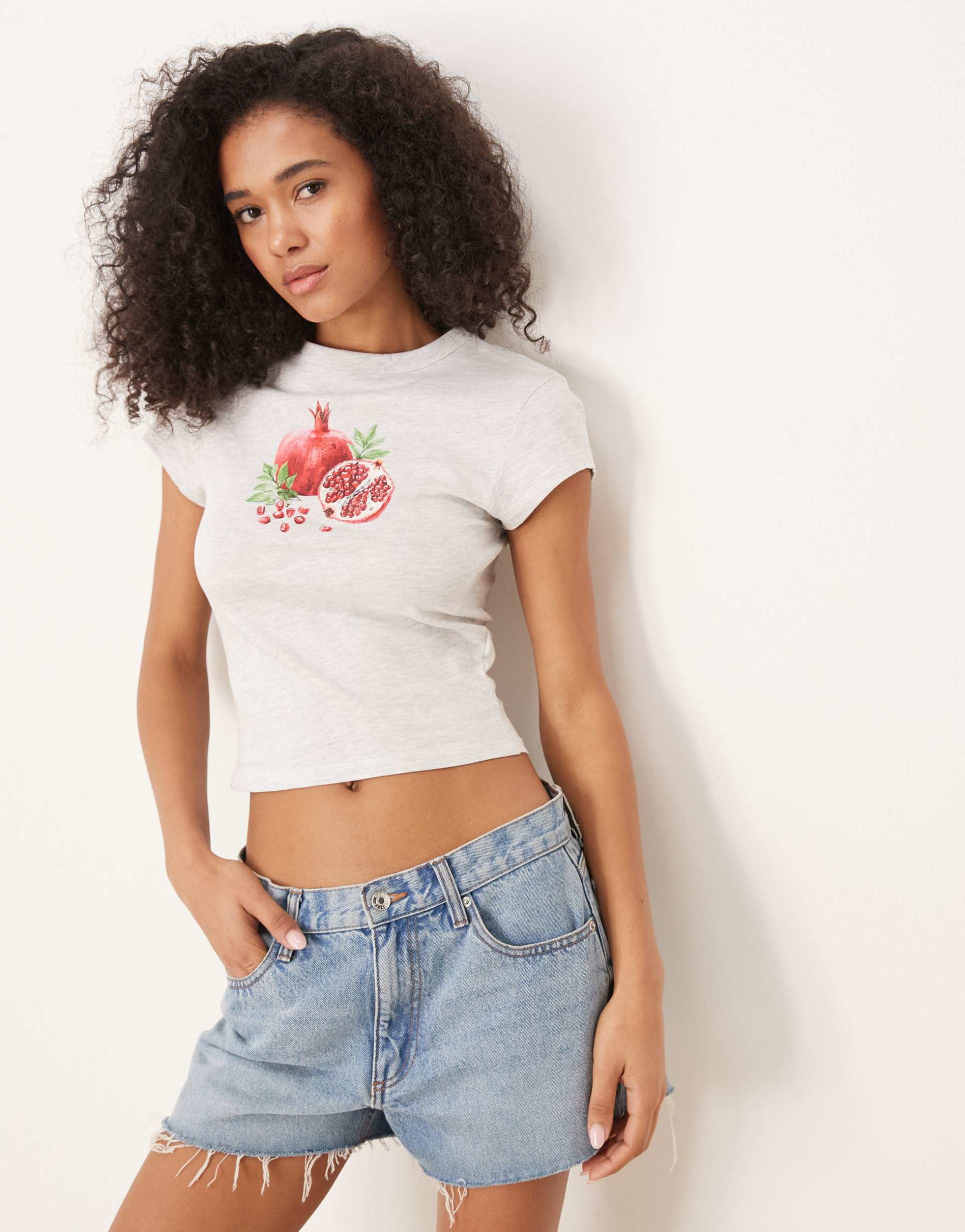 ASOS DESIGN BABY TEE WITH POMEGRANATE FRUIT GRAPHIC IN ICE HEATHER