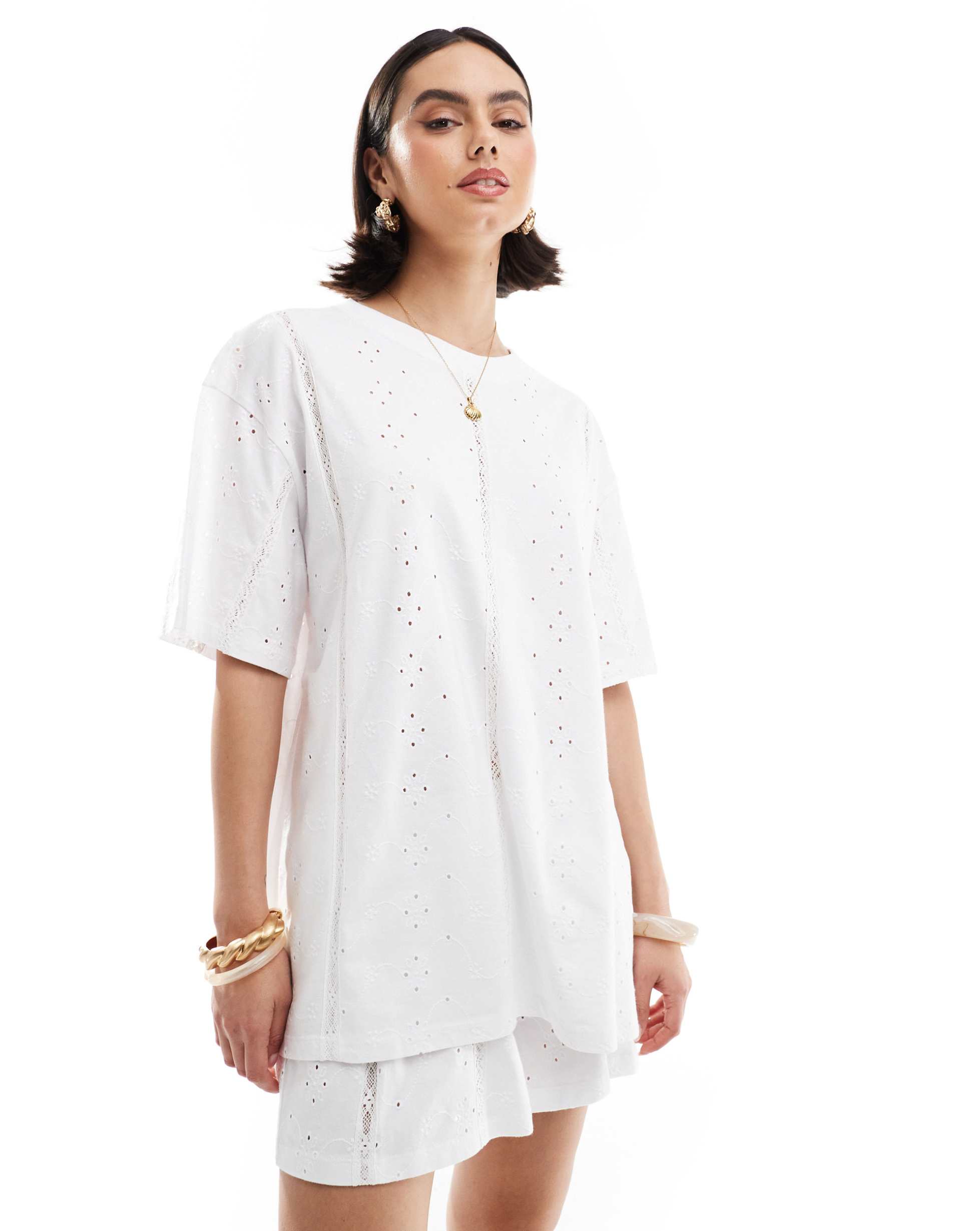 ASOS DESIGN BRODERIE OVERSIZED TEE WITH LACE TRIM INSERTS IN WHITE