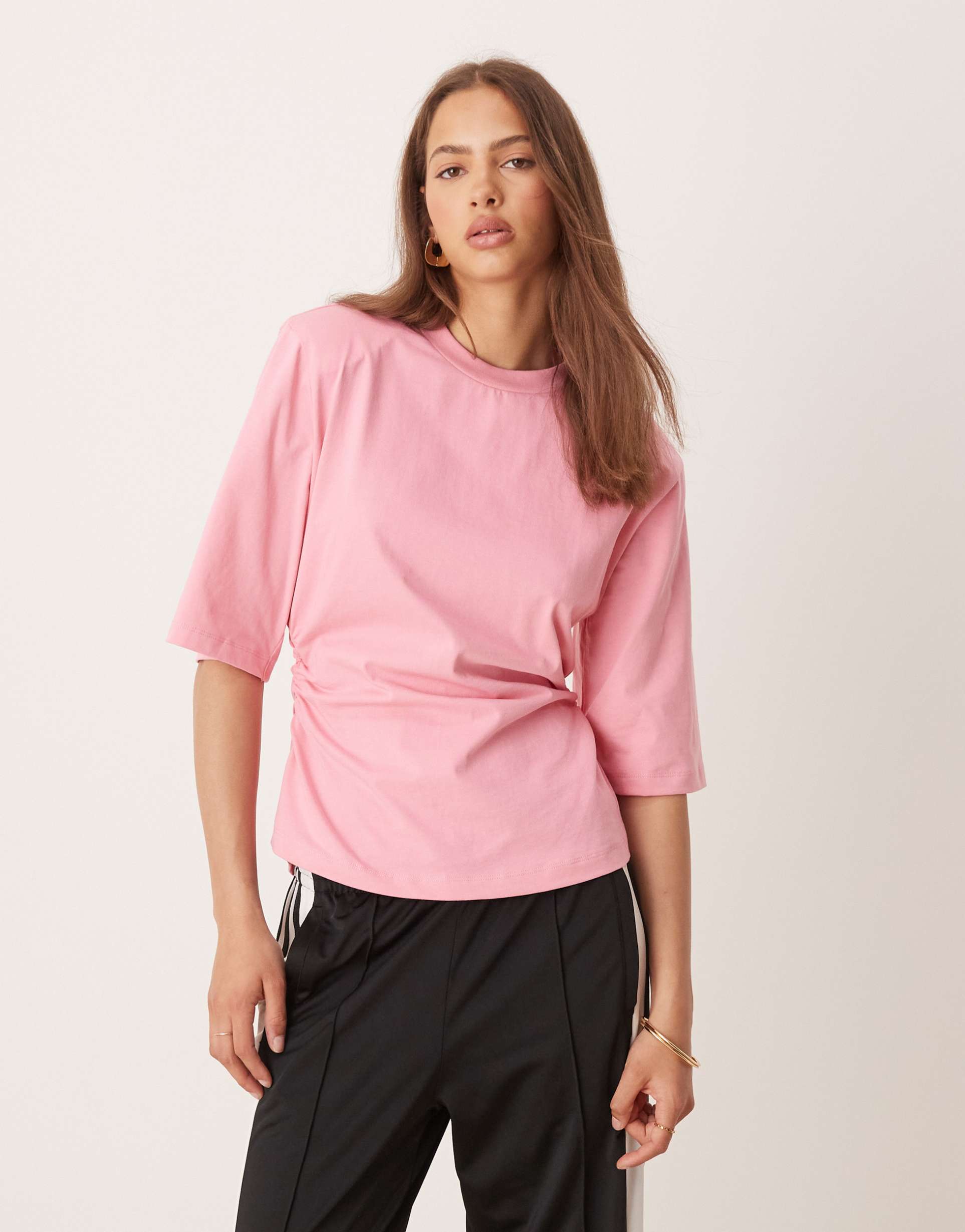 ASOS DESIGN CINCH WAIST SHOULDER PAD BASIC TEE IN PINK