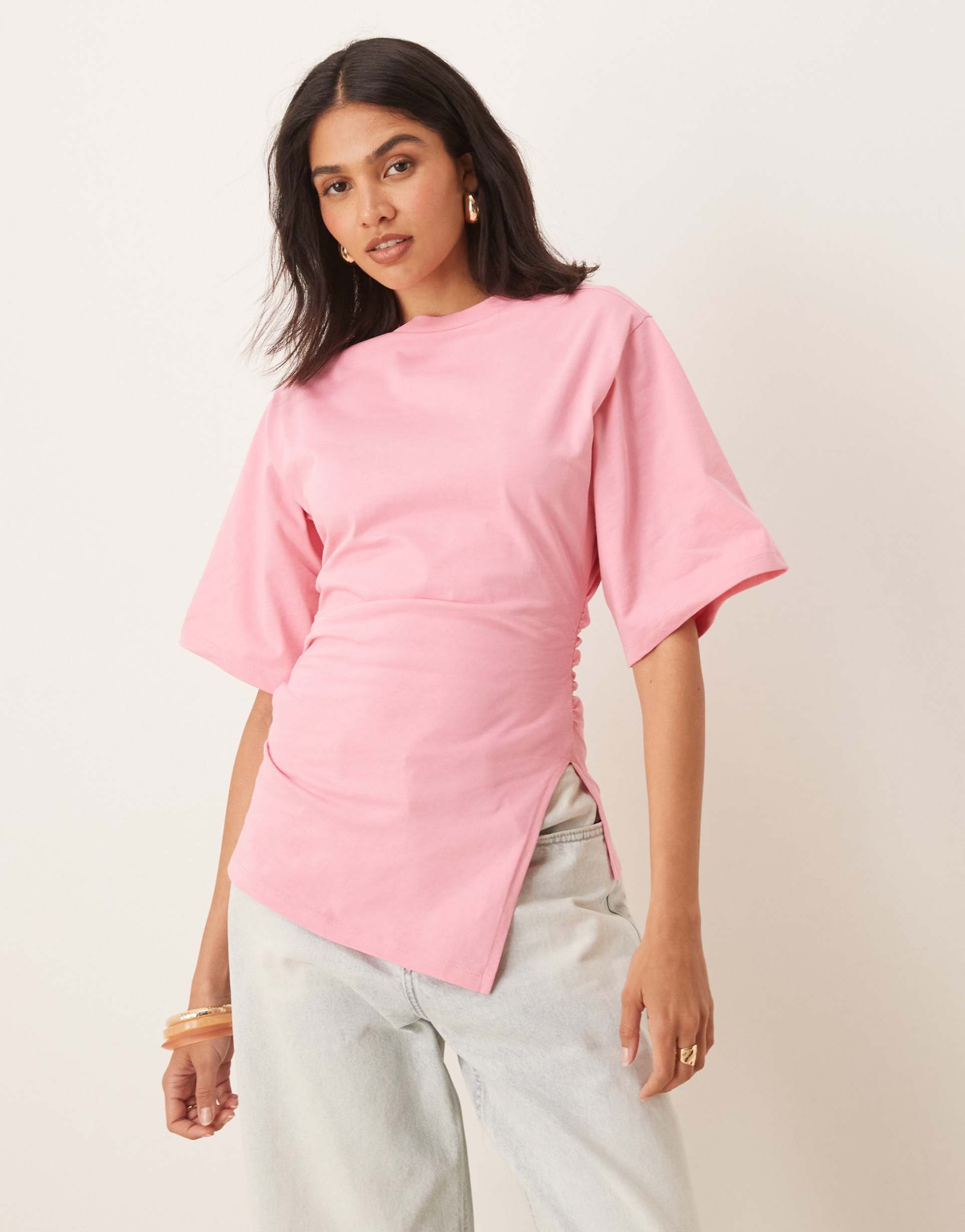ASOS DESIGN CINCHED T-SHIRT WITH ASYMMETRIC HEM IN PINK