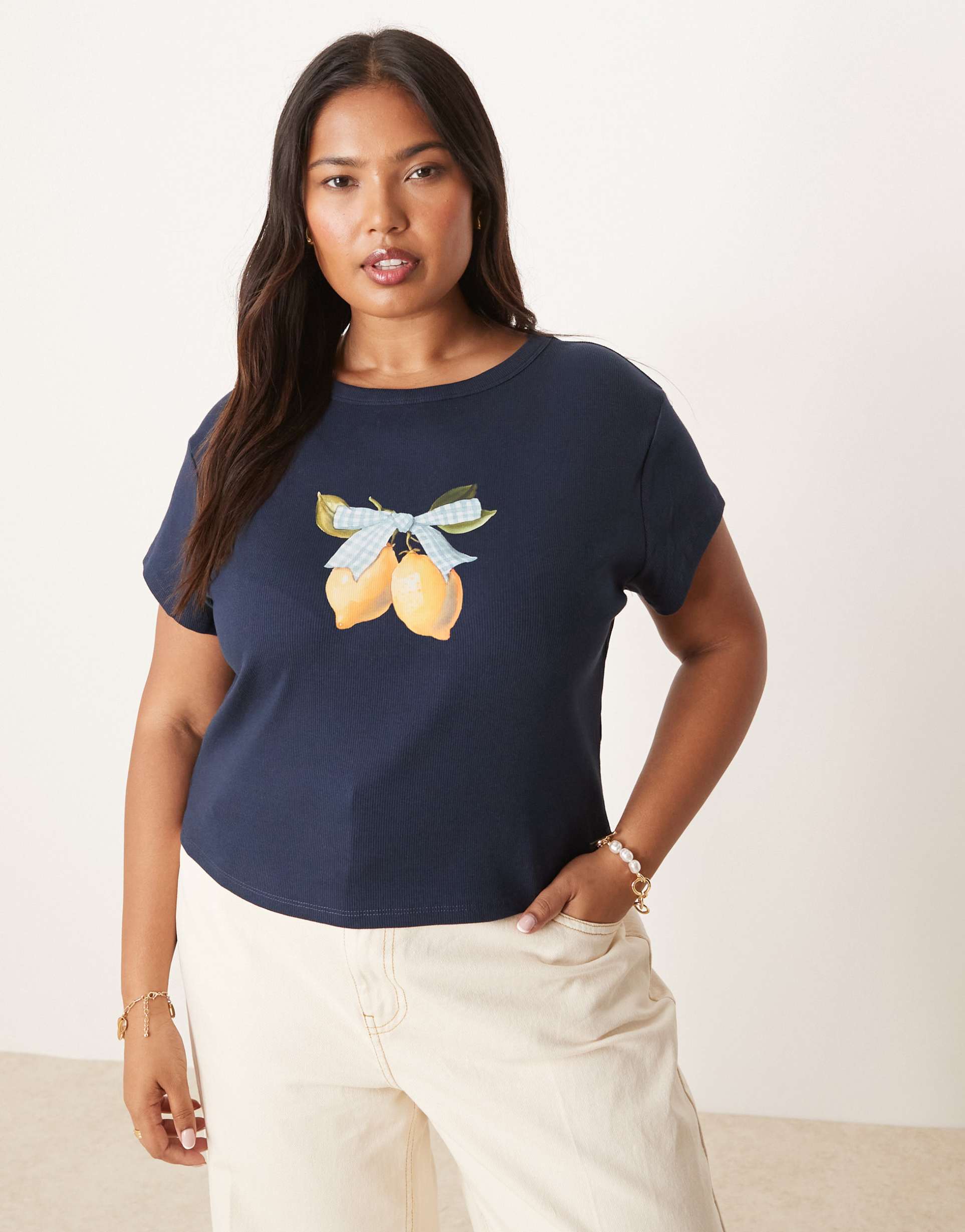 ASOS DESIGN CURVE BABY TEE WITH GINGHAM LEMON GRAPHIC IN NAVY