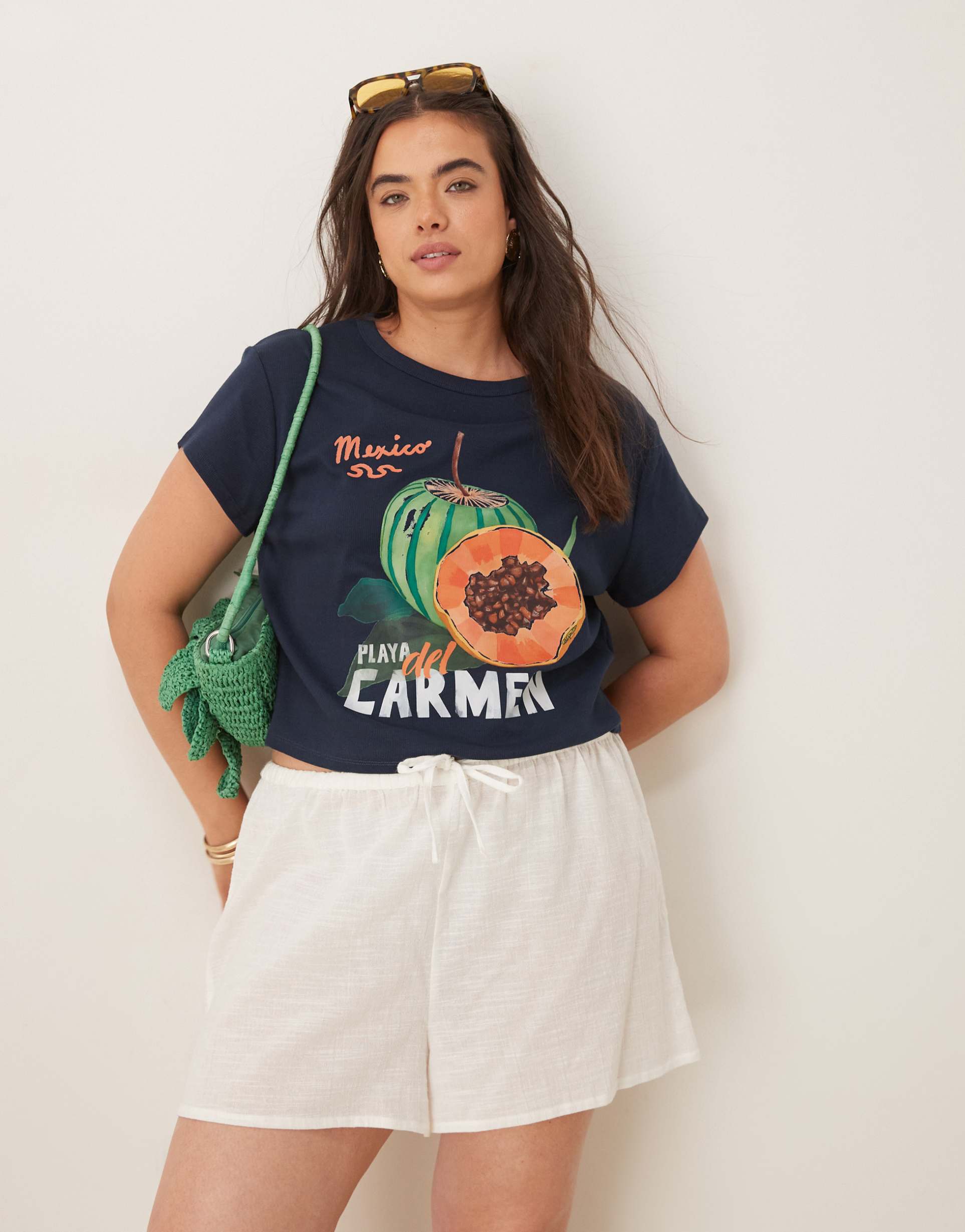 ASOS DESIGN CURVE BABY TEE WITH PLAYA DEL CARMEN FRUIT GRAPHIC IN NAVY