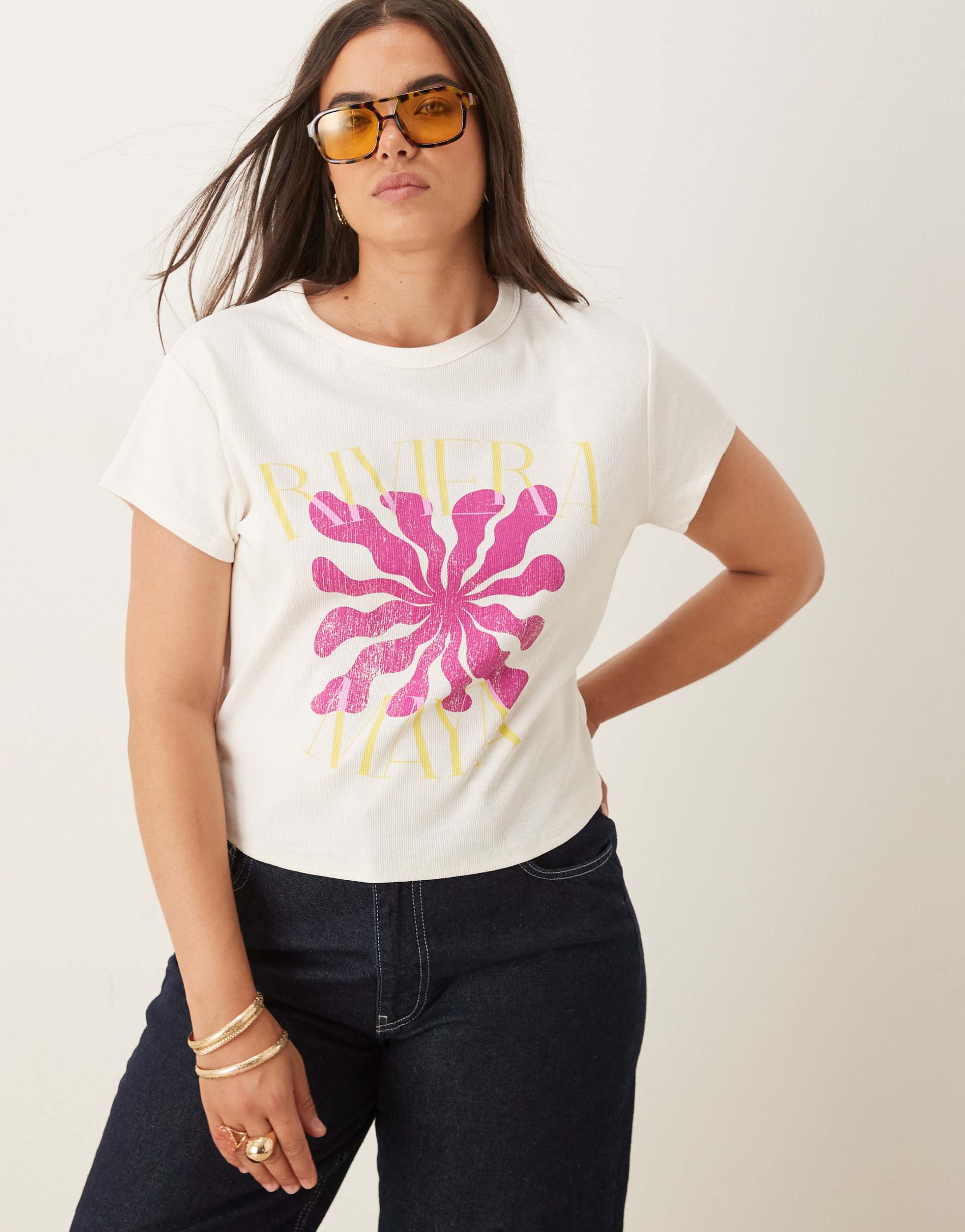 ASOS DESIGN CURVE BABY TEE WITH PURPLE FLOWER GRAPHIC IN CREAM