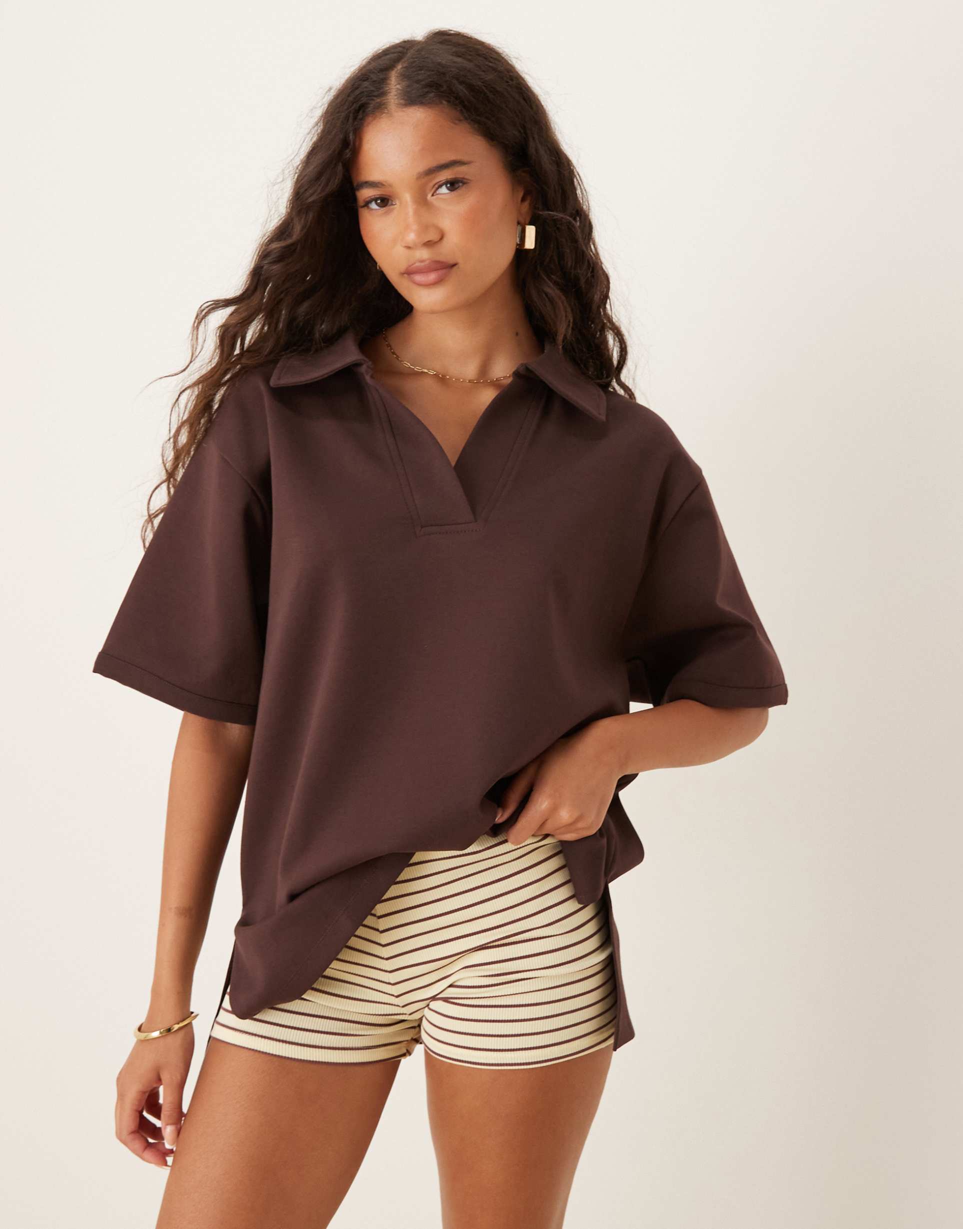 The ASOS DESIGN interlock rugby top in a rich matte brown offers a timeless classic silhouette with its polo collar and drop-shoulder half sleeves. Crafted from a comfortable cotton-polyester-elastane blend, this hip length top features a regular fit for easy, everyday wear. Its solid color and casual chic style make it perfect for casual outings, streetwear looks, and relaxed everyday wear. The pullover closure and soft fabric ensure comfort and versatility across all seasons.