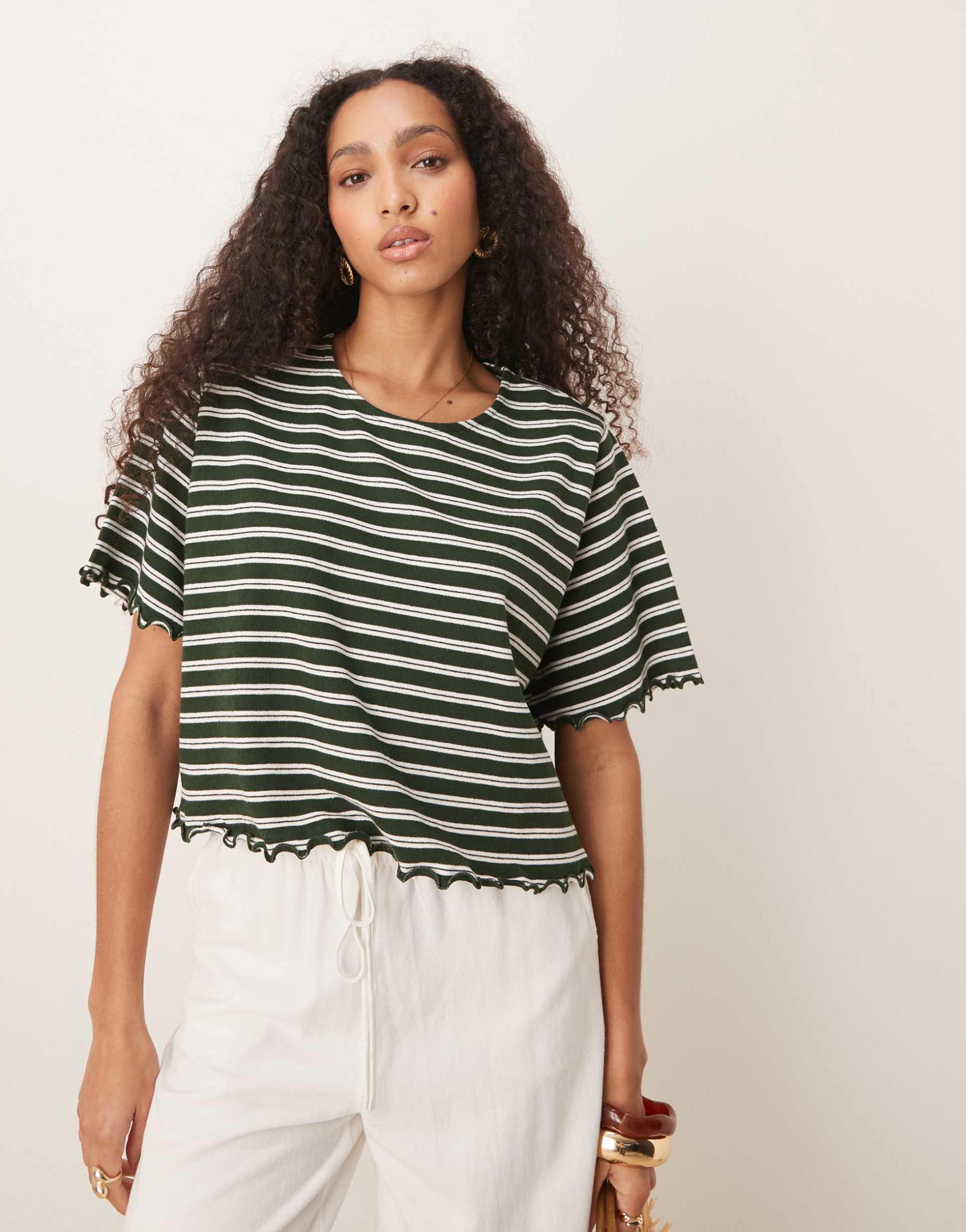 Soft cotton jersey with a relaxed regular fit defines this cropped tee, highlighted by a classic crew neckline and half-length sleeves. The green and white striped pattern runs all over, complemented by charming lettuce-edge ruffles at the hem and sleeve ends for a subtle flouncy effect. Ideal for spring and summer, this casual chic piece pairs effortlessly with casual and brunch looks or everyday wear, offering both comfort and style in one versatile top.