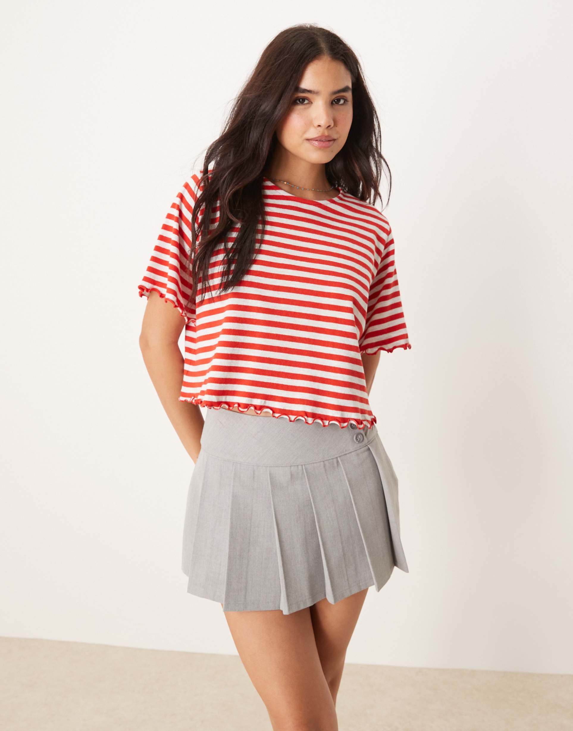 ASOS DESIGN LETTUCE HEM CROPPED TEE IN TEXTURED RED AND GRAY STRIPE