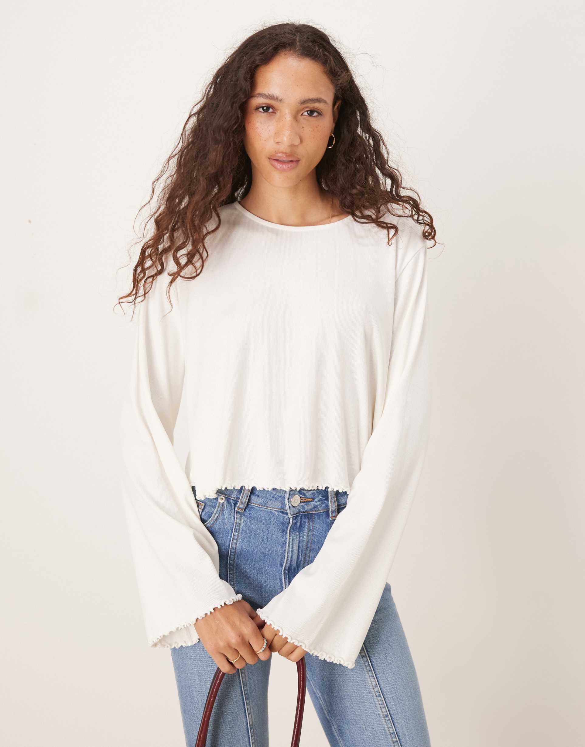 Soft cream cotton and a regular fit define this cropped long sleeve top with a classic crew neckline. The standout lettuce-edge hem adds a delicate ruffled finish, bringing subtle texture to a minimalist silhouette. This versatile piece suits casual, everyday wear, as well as brunch outings and relaxed spring or autumn days. Its pullover style and breathable fabric make it an effortless layering essential for a laid-back yet polished look.