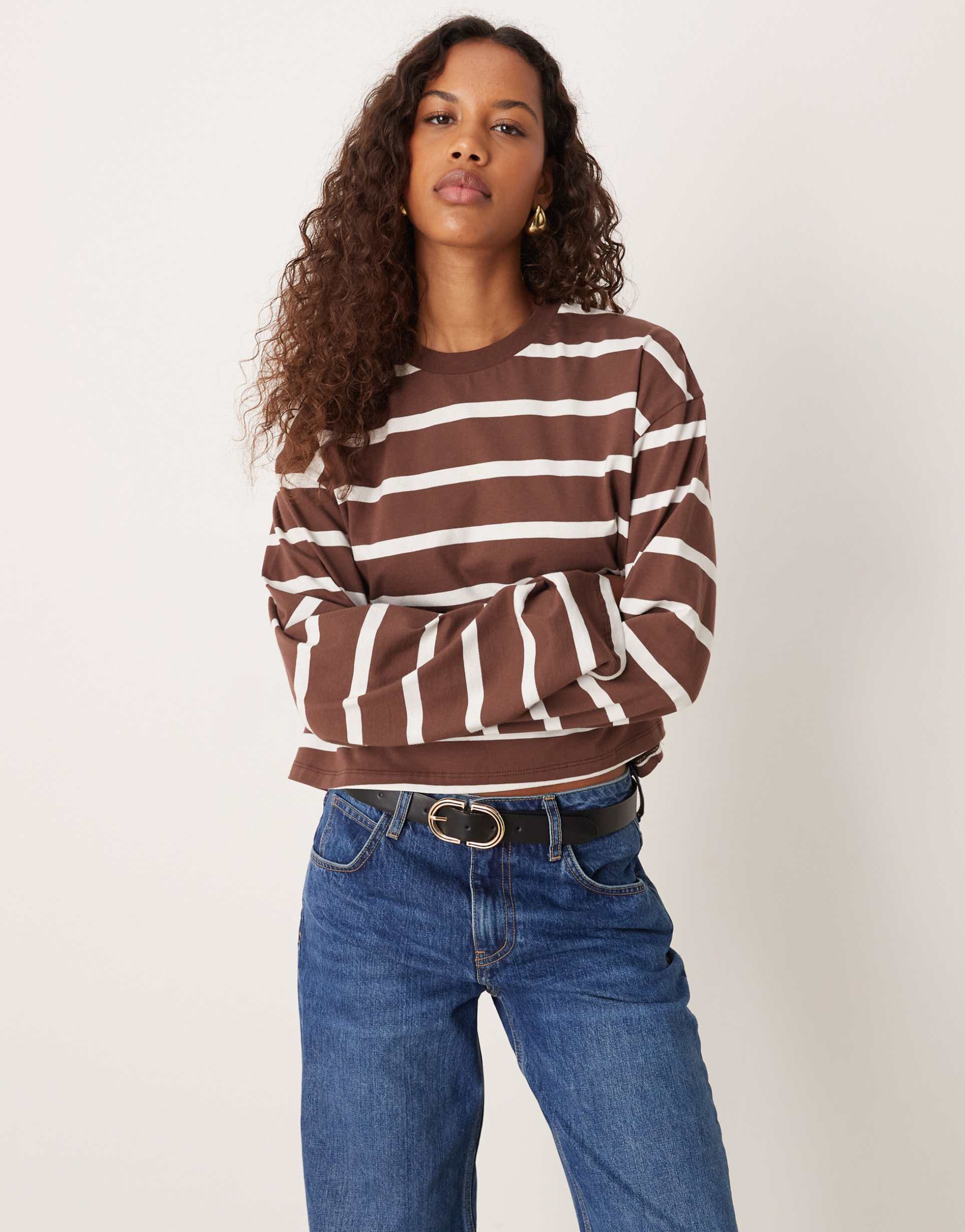 ASOS DESIGN LONG SLEEVE BOXY CROPPED T-SHIRT IN CHOCOLATE & CREAM STRIPES