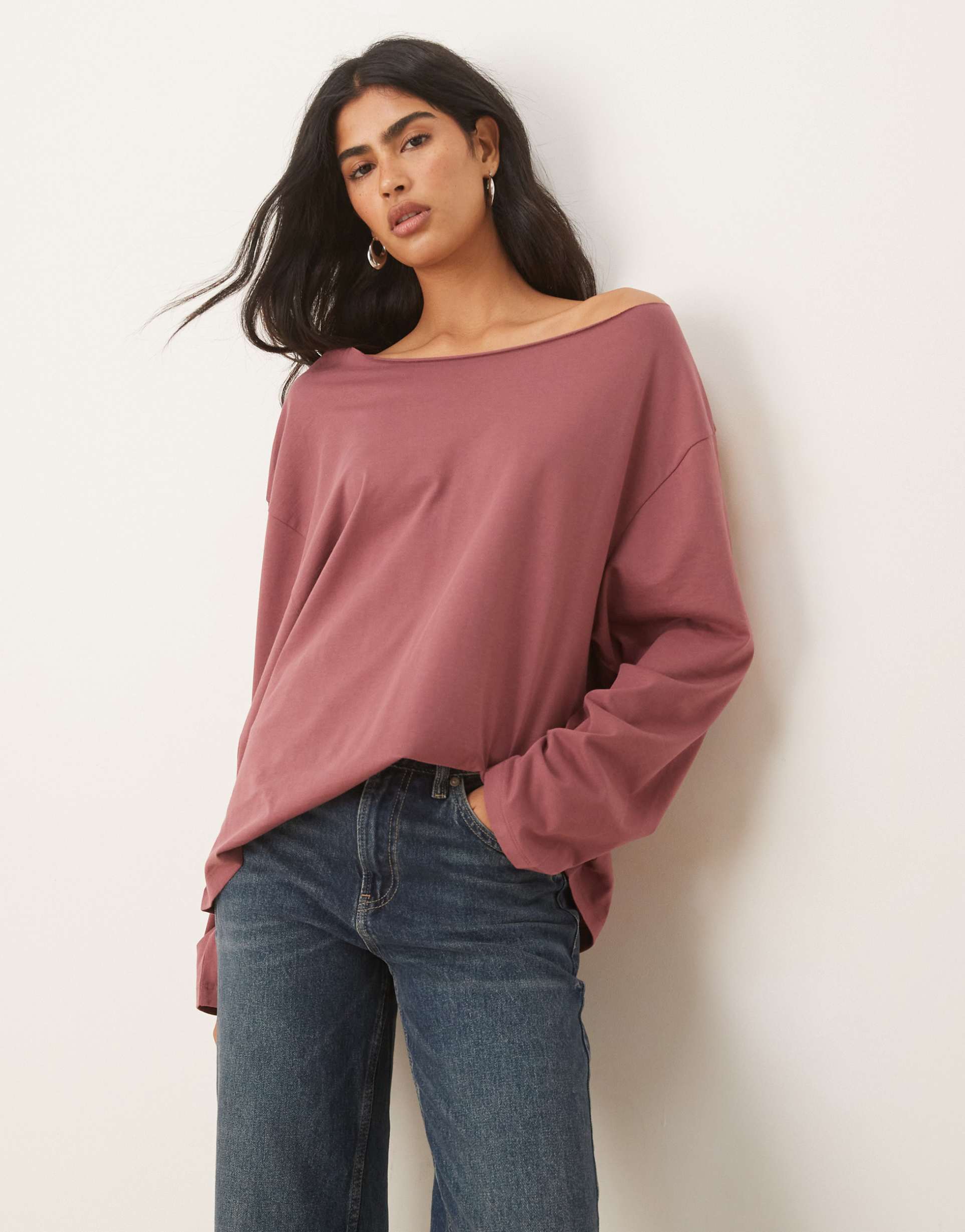 ASOS DESIGN OFF THE SHOULDER LONG SLEEVE TEE IN DARK ROSE