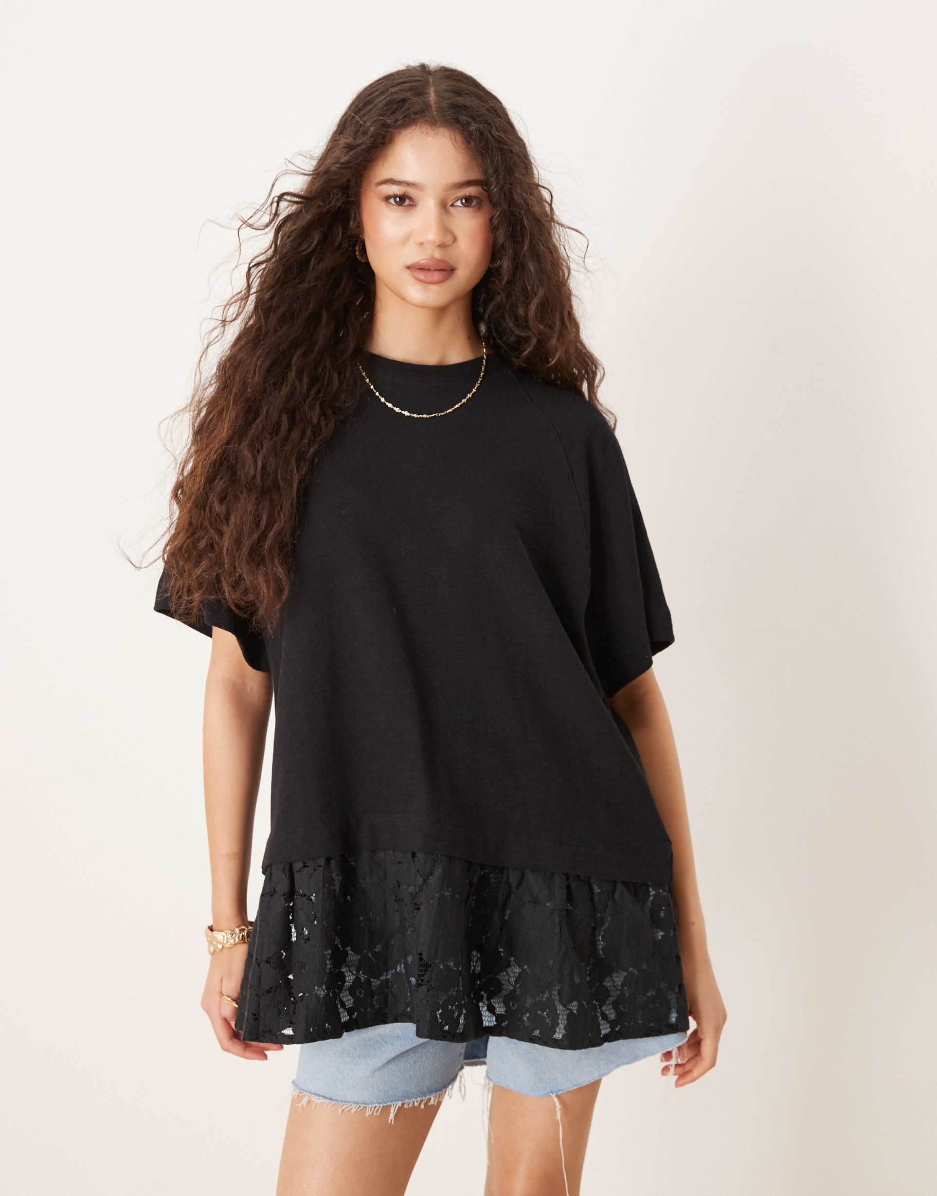 ASOS DESIGN OVERSIZED RAGLAN T-SHIRT WITH LACE HEM DETAIL IN BLACK