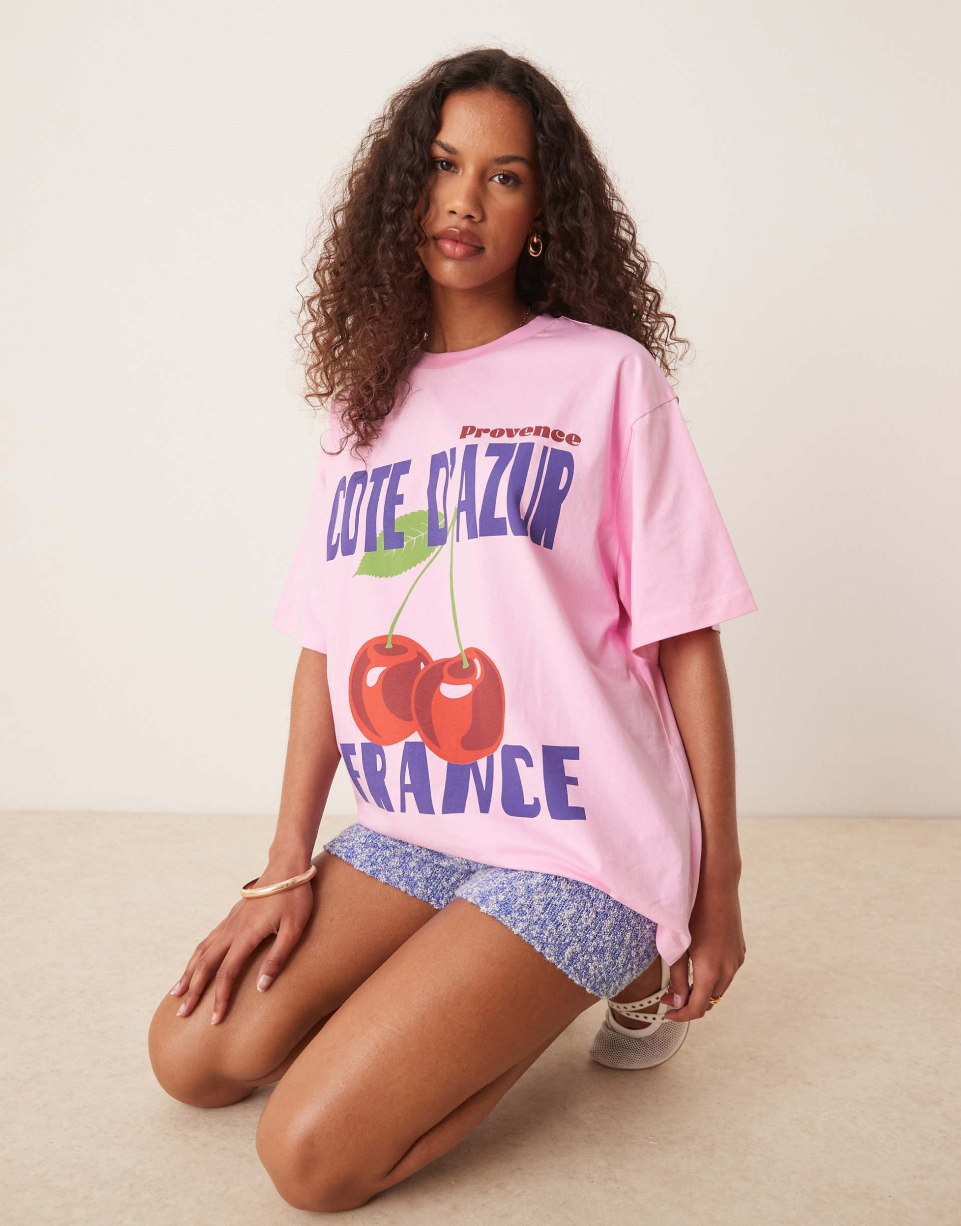 Soft cotton jersey fabric and an oversized fit define this pink ASOS DESIGN t-shirt, featuring a classic crew neck and regular half sleeves for relaxed comfort. Its hip-length silhouette is elevated by a bold cherry graphic print in vibrant red, green, and blue hues on the front, making it a standout casual chic piece. Ideal for everyday wear, street style outings, and casual occasions, this pullover tee combines comfort and playful style effortlessly.