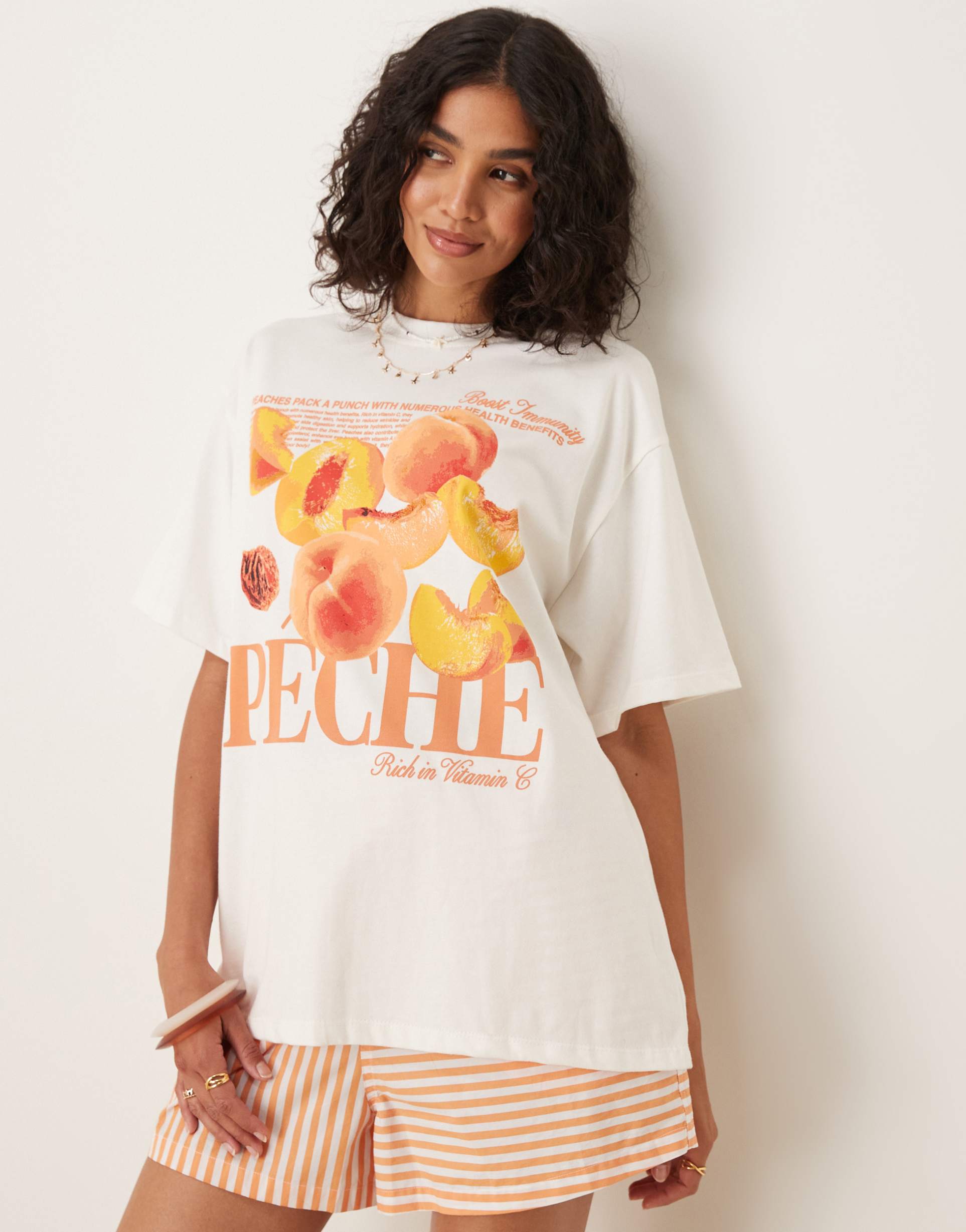 Soft cotton jersey and a relaxed oversized fit define this ASOS DESIGN T-shirt, featuring a classic crew neck and half sleeves with drop shoulder detail. The hip-length silhouette showcases a vibrant peach graphic print on a clean white base, bringing a fresh and casual vibe perfect for everyday wear. Ideal for casual outings, street style looks, or laid-back loungewear, this tee combines comfort with a playful graphic element, making it a versatile addition to your wardrobe.