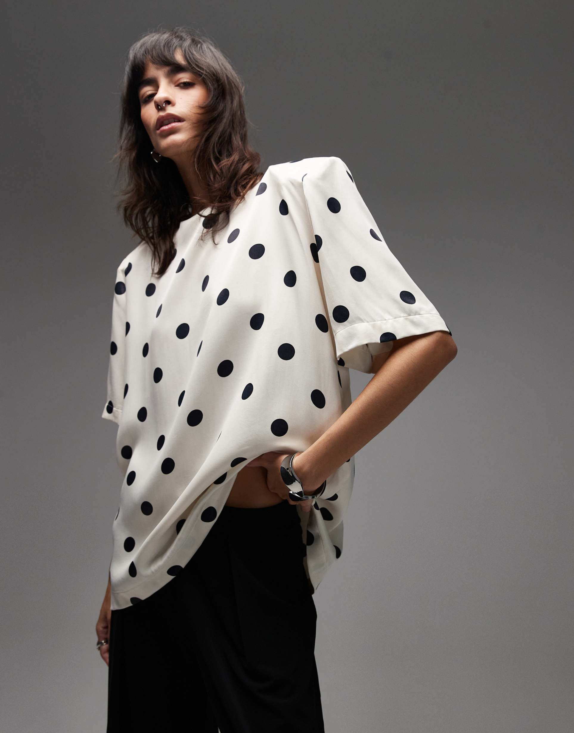 ASOS DESIGN SATIN SHOULDER PADS T-SHIRT IN CREAM POLKA DOTS