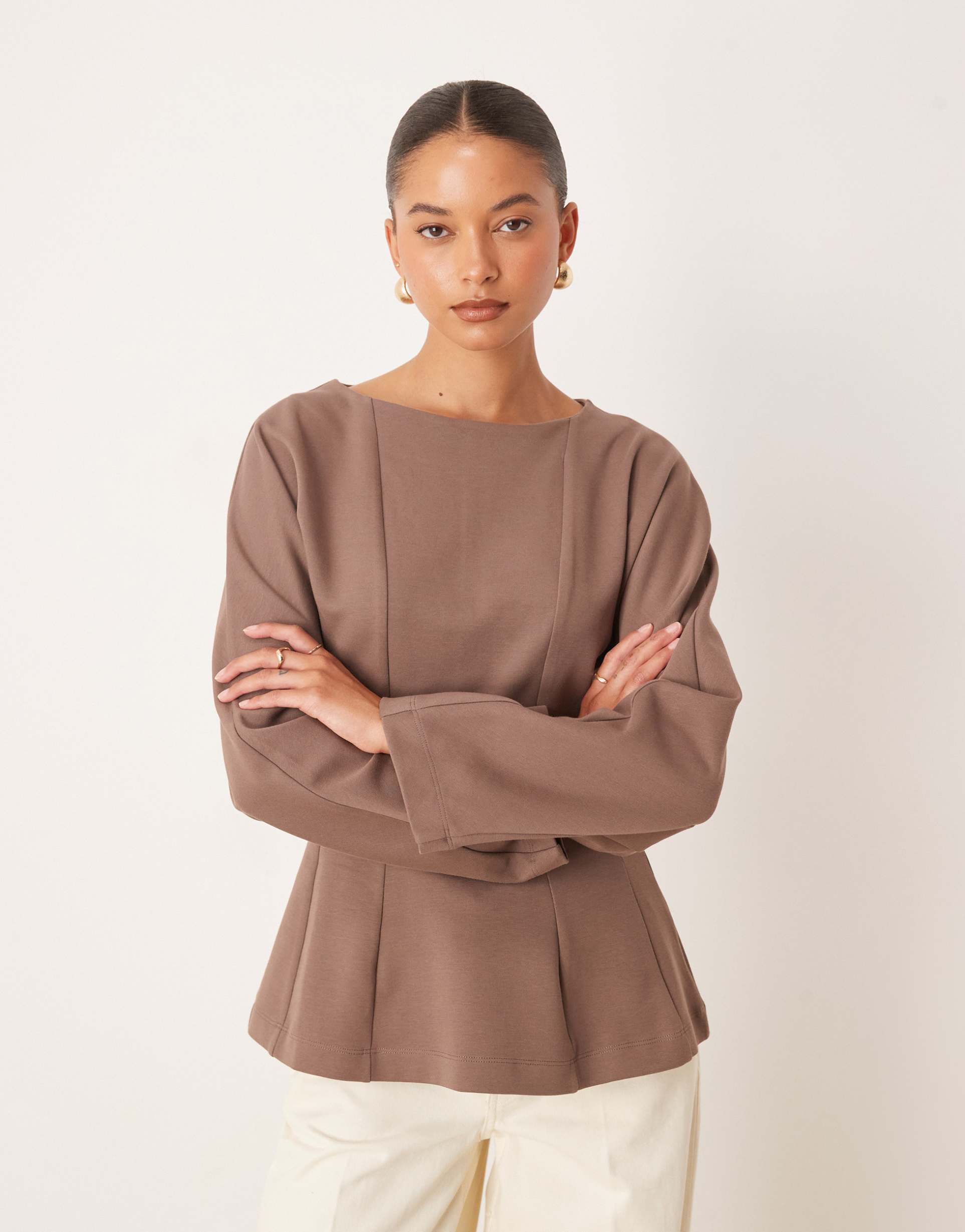 ASOS DESIGN SEAM DETAIL WAISTED LONG SLEEVE TEE IN CHOCOLATE
