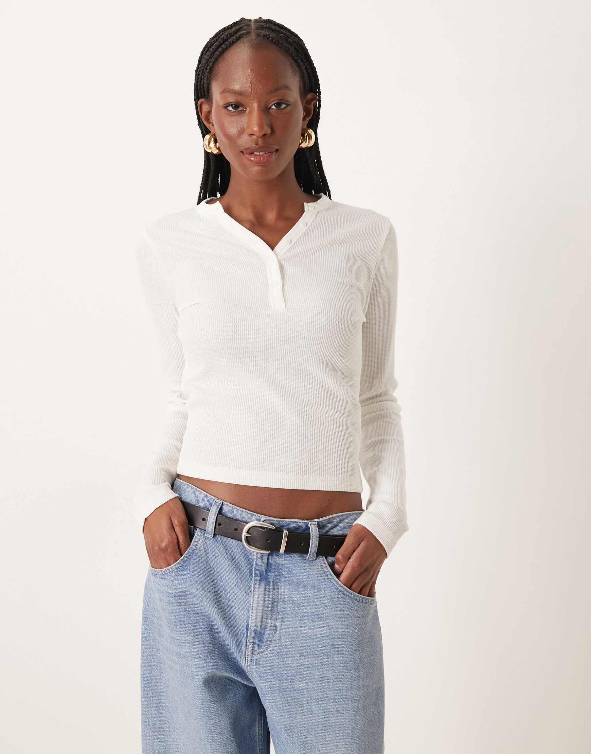 ASOS DESIGN SHRUNKEN WAFFLE KNIT LONG SLEEVE HENLEY TEE IN CREAM