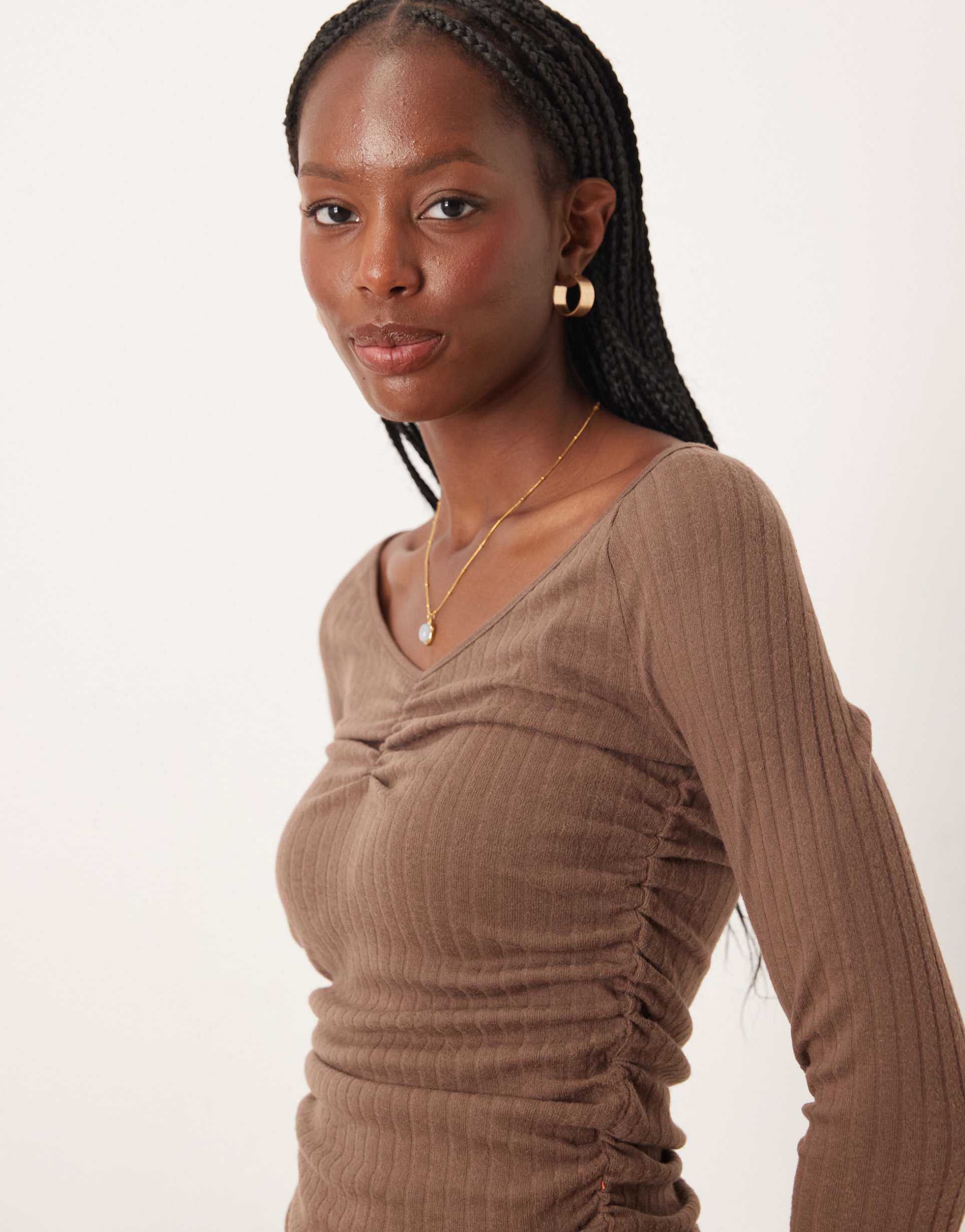 ASOS DESIGN SOFT BRUSH RIB V NECK LONG SLEEVE T-SHIRT IN CHOCOLATE