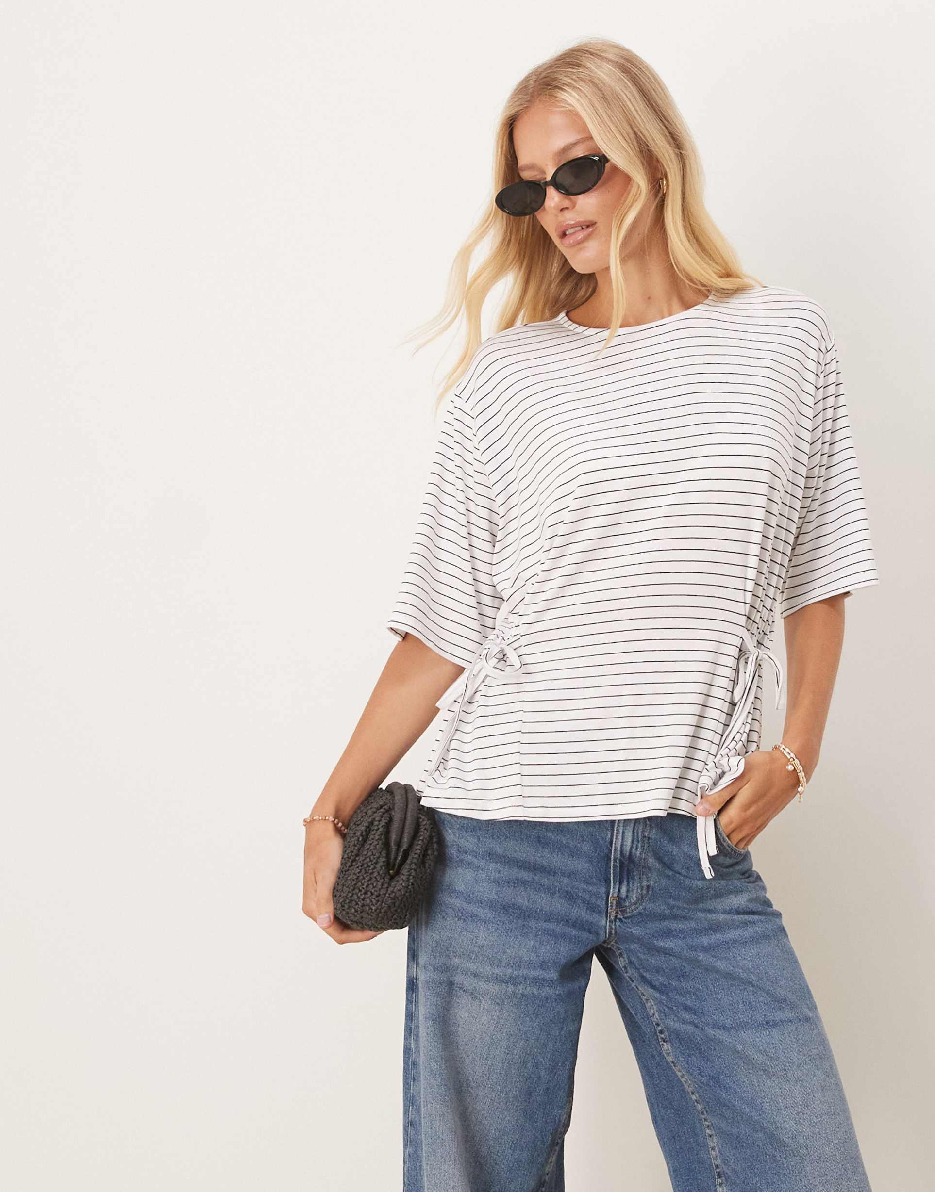 ASOS DESIGN STRIPED CINCHED TIE SIDE TEE IN IVORY