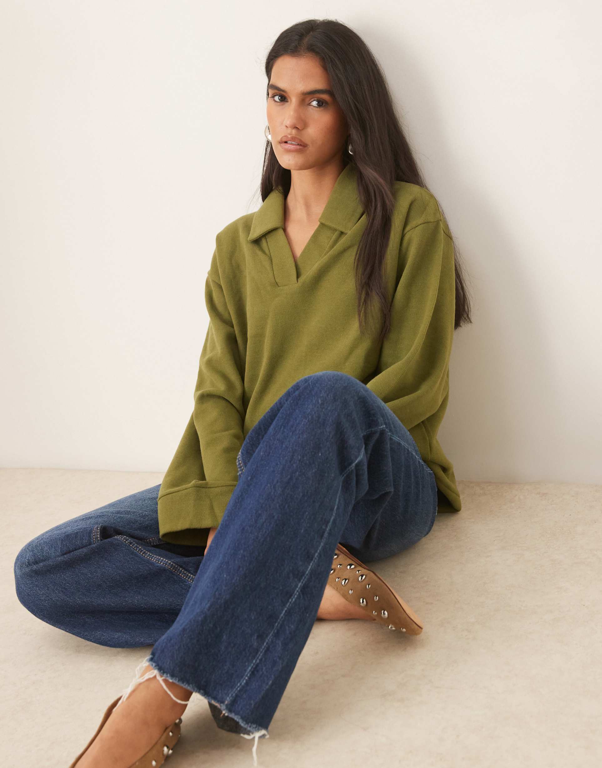 ASOS DESIGN SUPERSOFT RUGBY COLLAR LONG SLEEVE TEE IN KHAKI