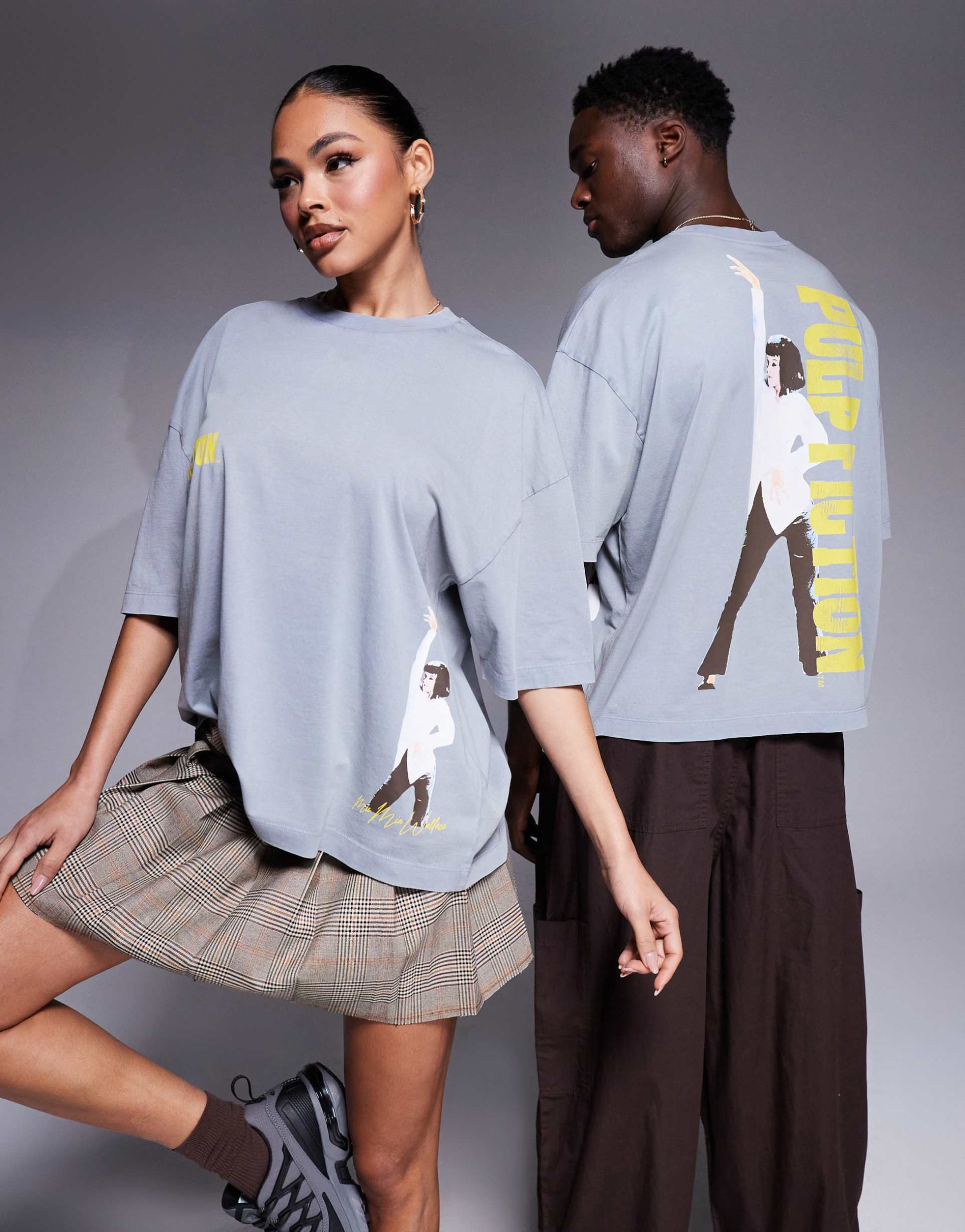 ASOS DESIGN UNISEX BOXY OVERSIZED T-SHIRT WITH PULP FICTION PRINT IN WASHED GRAY