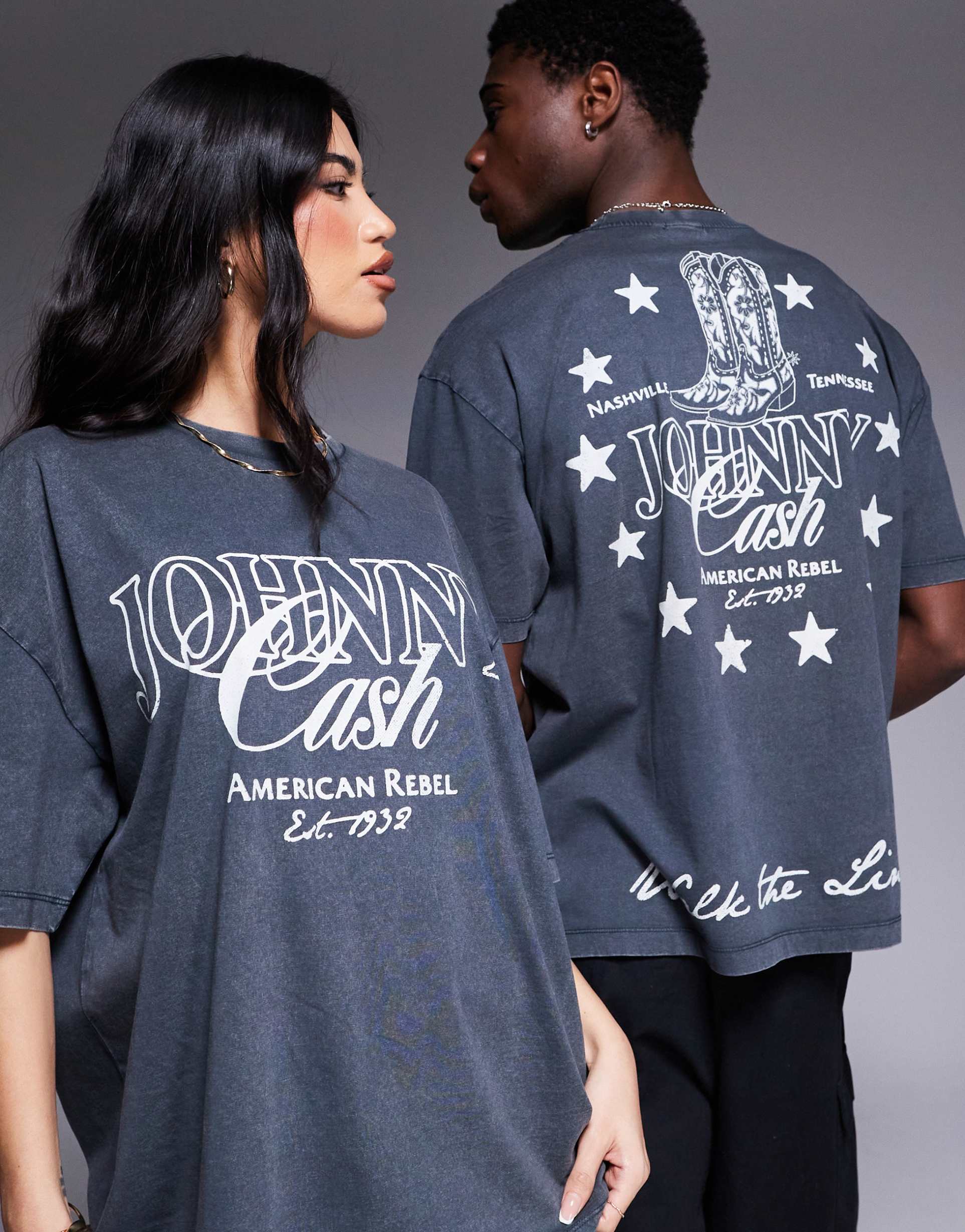 ASOS DESIGN UNISEX OVERSIZED T-SHIRT WITH JOHNNY CASH PRINTS IN WASHED BLACK