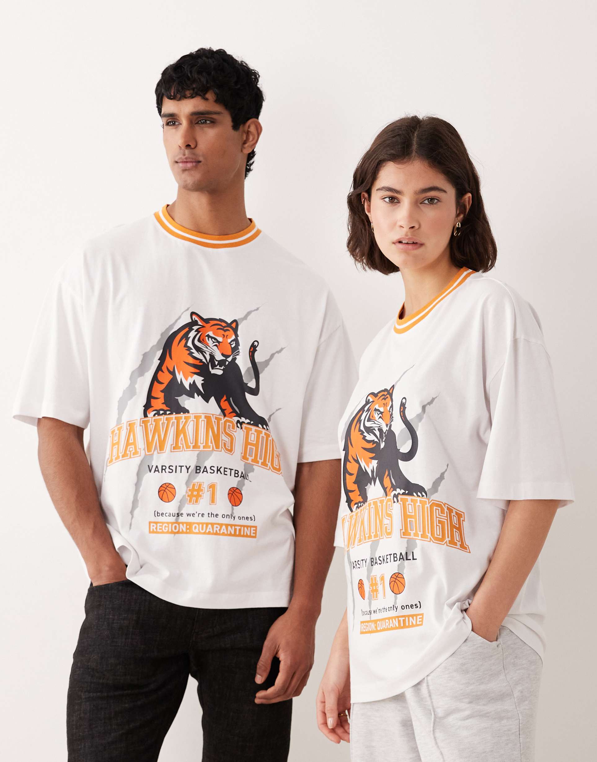 ASOS DESIGN UNISEX OVERSIZED T-SHIRT WITH STRANGER THINGS COLLEGE PRINTS IN WHITE