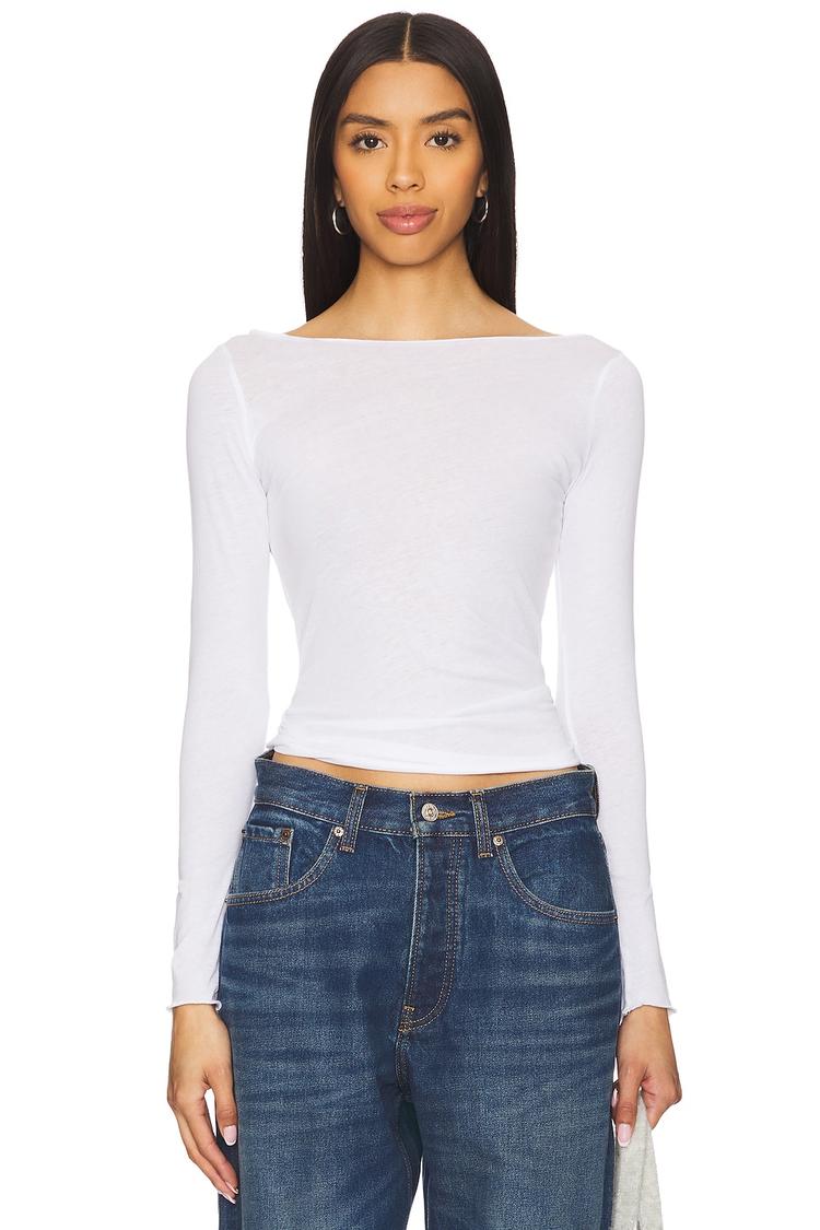 Soft cotton jersey fabric meets a classic boatneck silhouette in this slim-fitting long sleeve tee. Its lightweight, semi-sheer texture and raw hem add subtle edge to an otherwise minimalist design, perfect for layering or wearing alone. Falling to the waist, this shell top pairs seamlessly with denim or tailored trousers, making it ideal for casual days, everyday wear, or relaxed work environments. Embrace a clean, timeless look that transitions effortlessly across spring, summer, and autumn seasons.