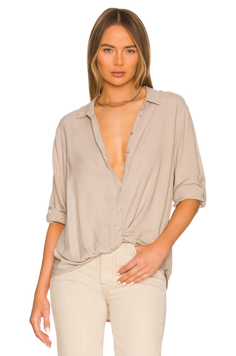 Effortless elegance defines this relaxed-fit button-up tee crafted from lightweight rayon fabric. Featuring a classic collar and three-quarter cuffed sleeves, it offers comfort and style for spring through autumn. The hip-length curved shirttail hem is enhanced with a distinctive twist knot detail, adding a modern touch to this minimalist beige top. Ideal for casual outings, brunch dates, or smart workwear, this versatile piece blends sophistication with laid-back charm, making it a must-have staple in any wardrobe.
